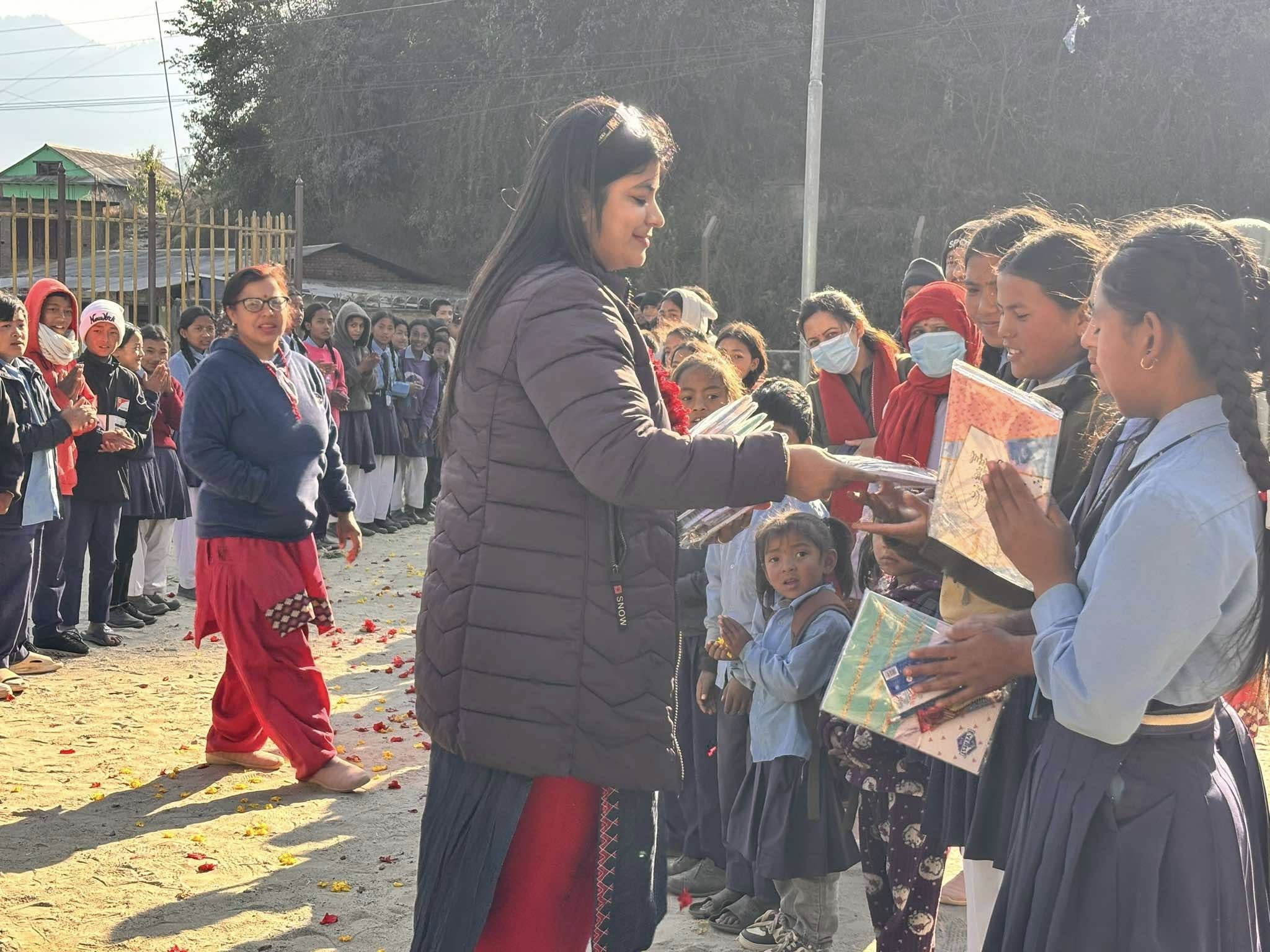 थाहानगर पालुङको सरस्वती स्कूलका १ सय २५ विद्यार्थीलाई न्यानो कपडा र शैक्षिक सामग्री