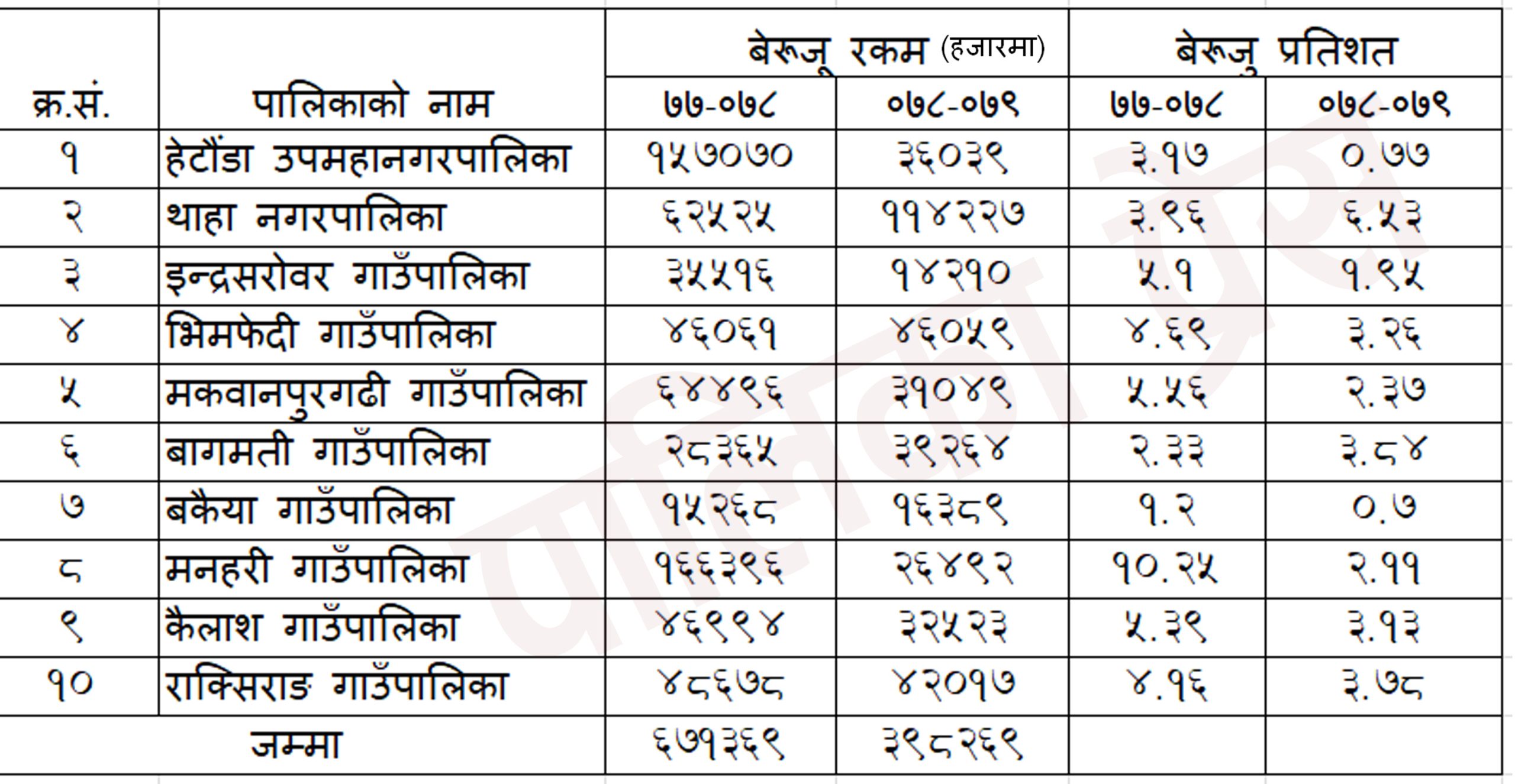 अघिल्लो आर्थिक वर्ष २०७७/०७८ मा हेटौंडा उपमहानगरपालिकाको बेरुजु १५ करोड ७० लाख ७० हजार थियो भने आर्थिक वर्ष २०७८/०७९ मा ३ करोड ६० लाख ३९ हजार रहेको छ । त्यस्तै थाहा नगरपालिकाको अघिल्लो आर्थिक वर्ष ६ करोड २५ लाख २५ हजार थियो भने पछिल्लो वर्ष ११ करोड ४२ दलाख २७ हजार रहेको छ । इन्द्रसरोवरको ३ करोड ५५ लाख १६ हजार भएकोमा १ करोड ४२ लाख १० हजार, भिमफेदीको ४ करोड ६० लाख ६१ हजार भएकोमा ३ करोड १० लाख ४९ हजार, मकवानपुरगढीको ६ करोड ४४ लाख ९६ हजार भएकोमा ३ करोड १० लाख ४९ हजार, बागमतीको २ करोड ८३ लाख ६५ हजार भएकोमा ३ करोड ९२ लाख ६४ हजार देखिएको छ । यसैगरी बकैयाको १ करोड ५२ लाख ६८ हजार भएकोमा १ करोड ६३ लाख ८९ हजार, महनरीको १६ करोड ६३ लाख ९६ हजार भएकोमा २ करोड ६४ लाख ९२ हजार, कैलाशको ४ करोड ६८ लाख ९४ हजार भएकोमा ३ करोड २५ लाख २३ हजार र राक्सिराङ गाउँपालिकाको ४ करोड ८६ लाख ७८ हजार भएकोमा आर्थिक वर्ष २०७८/०८९ मा ४ करोड २० लाख १७ हजार देखिएको प्रतिवेदन सार्वजनिक भएको छ ।