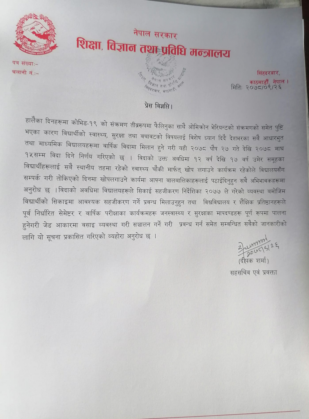 २५ पुसमा सीसीएमसीसीले वार्षिक बिदामा मिलान हुने गरी माघ १५ सम्म विद्यालय बन्द गर्न शिक्षा मन्त्रालयसमक्ष सिफारिस गरेको थियो । कक्षा १ देखि १२ सम्म र सीटीईभीटीअन्तर्गतका कक्षा पुस २७ देखि माघ १५ सम्म बन्द गर्ने निर्णय शिक्षा मन्त्रालयले गरेको हो । भौतिक उपस्थितिमा सञ्चालन हुने कक्षा बन्द गरिएपछि वैकल्पिक माध्यमबाट कक्षा सञ्चालन गरिने मन्त्रालयले जनाएको छ ।