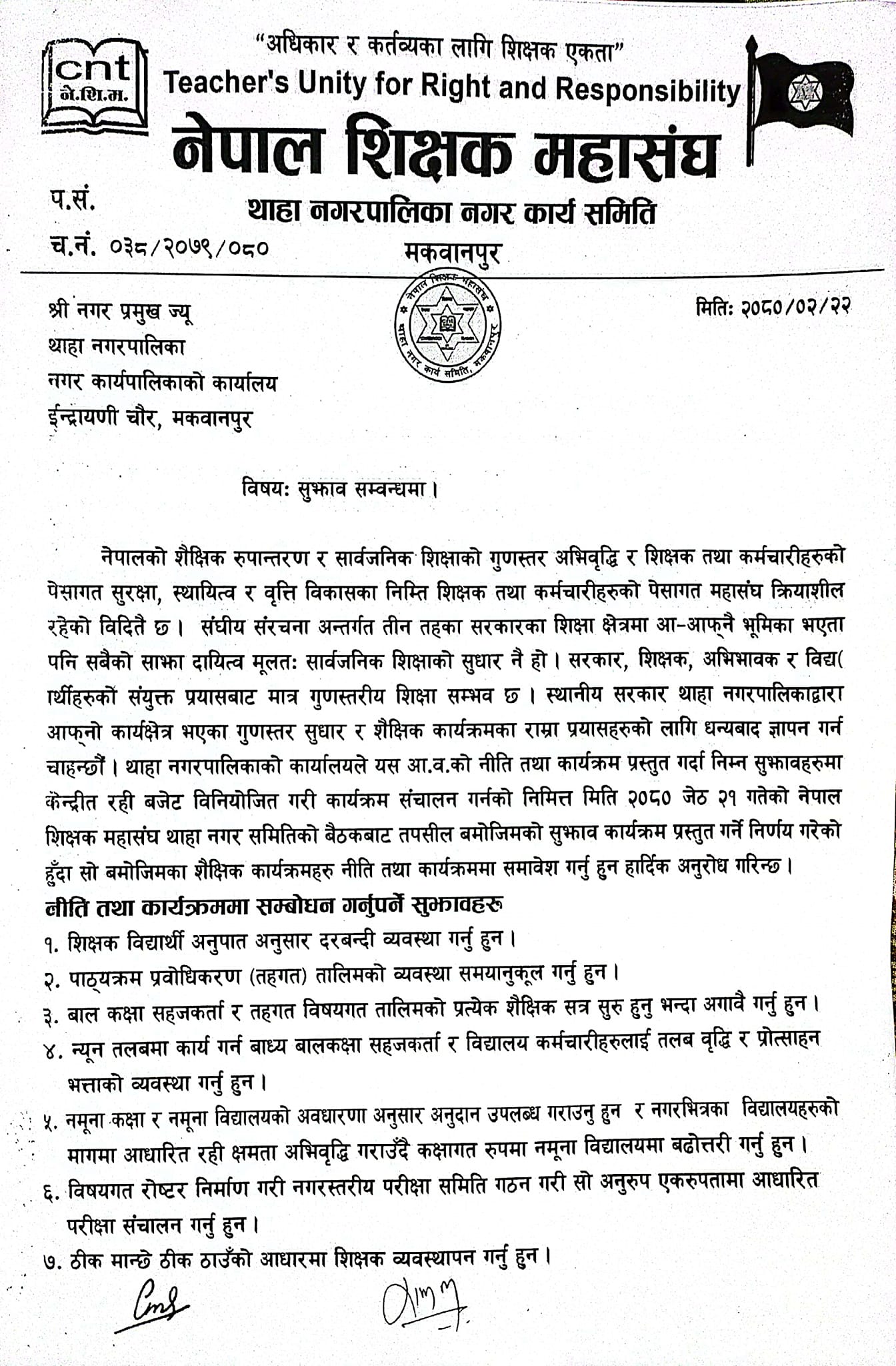 सुझाव पत्र नगर प्रमुख विष्ट तथा उपप्रमुख भरत गोपालीले बुझेका छन् । सुझाव पत्र बुझाउँदै महासंघ थाहानगरका अध्यक्ष राजाराम कार्कीले कार्यान्वयन गरिदिन ध्यानाकर्षण गराए । सुझावपत्रमा थाहा नगरपालिकाको शिक्षाको गुणस्तर र शिक्षकहरुको क्षमता अभिवृद्धि र पेशागत सुरक्षा र दायित्वलगायतका सवालहरु पेश भएको छ । १९ बँुदे उक्त सुझाव बुझाउन महासंघमा आवद्ध शिक्षकहरु नगरपालिका पुगेका थिए ।