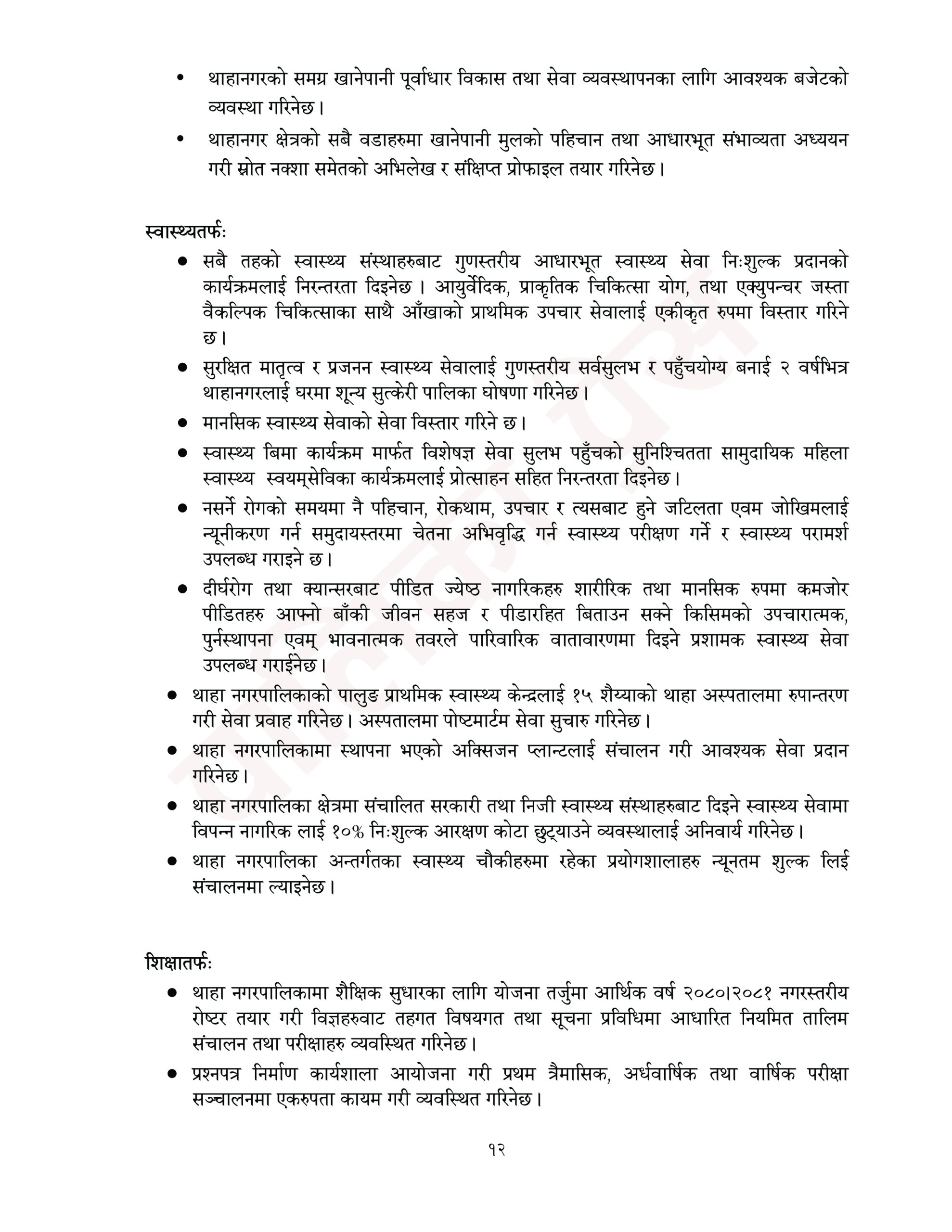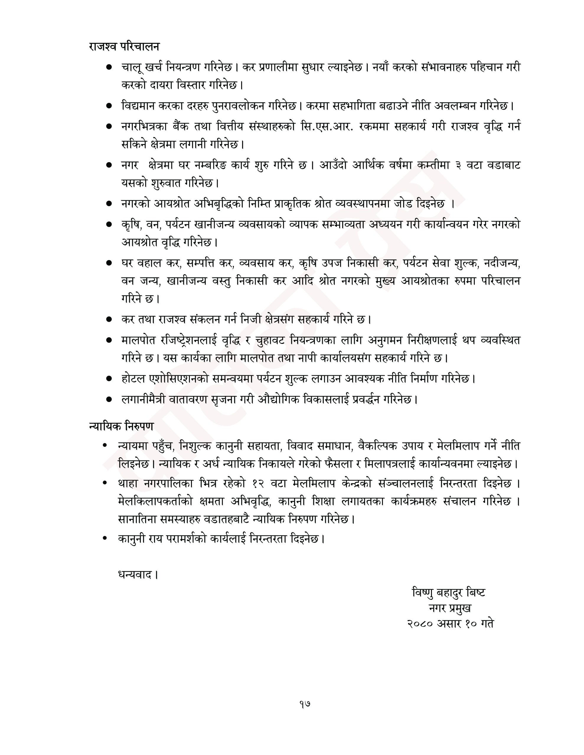 थाहा नगरपालिकाले आर्थिक वर्ष २०८०/०८१ को वार्षिक नीति तथा कार्यक्रम सार्वजनिक गरेको छ । पालुङ जेसिज सभाहलमा १० असारमा भएका १३ औं नगरसभामा नगर प्रमुख विष्णु बहादुर विष्टले नीति तथा कार्यक्रम पेश गरेका हुन् ।