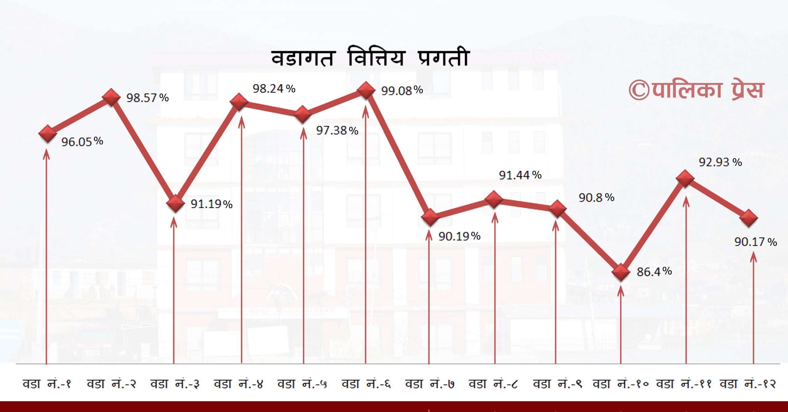 यस अन्तर्गत वडा नम्बर १ ले ९६.०५ प्रतिशत, वडा नम्बर २ ले ९८.५७ प्रतिशत, वडा नम्बर ३ ले ९१.१९ प्रतिशत, वडा नम्बर ४ ले ९८.२४ प्रतिशत, वडा नम्बर ५ ले ९७.३८ प्रतिशत, वडा नम्बर ६ ले ९९.०८ प्रतिशत, वडा नम्बर ७ ले ९०.१९ प्रतिशत, वडा नम्बर ८ ले ९१.४४ प्रतिशत, वडा नम्बर ९ ले ९०.८ प्रतिशत, वडा नम्बर १० ले सबभन्दा कम ८६.४ प्रतिशत, वडा नम्बर ११ ले ९२.९३ प्रतिशत र वडा नम्बर १२ ले ९०.१७ प्रतिशत खर्च गरेको समिक्षामा जानकारी दिइएको छ ।
