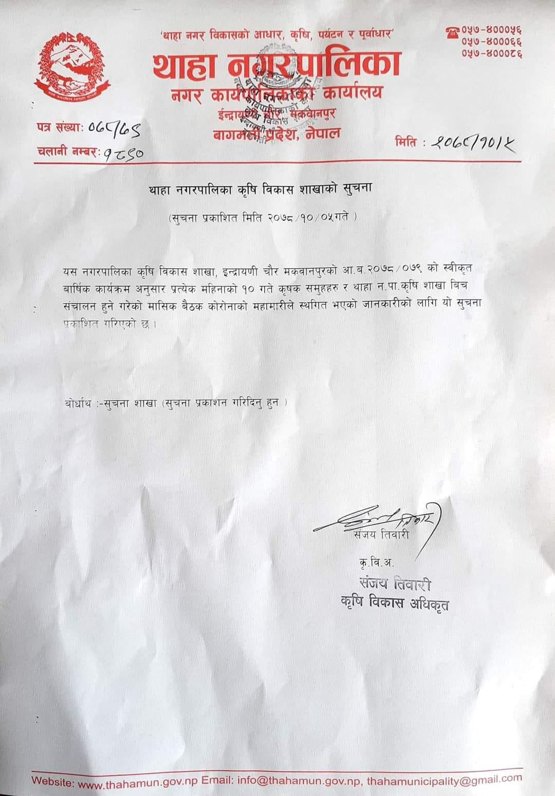 विश्वभर फैलँदै गरेको कोभिड–१९ को तेस्रो भेरियन्टका कारण संक्रमण जोखिम भएकोले बैठक स्थगित गरिएको थाहा नगरपालिका कृषि विकास शाखाले जानाएको छ । शाखाले प्रत्येक महिनाको १० गते बैठक आयोजना गर्दै आएको थियो ।