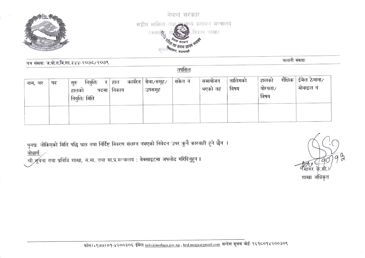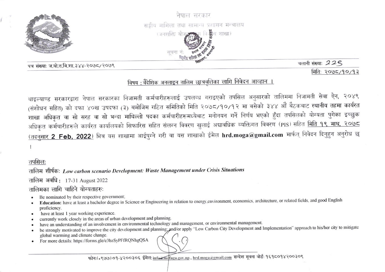 तालिम लिन इच्छुक अधिकृतस्तरका कर्मचारीहरुले नाम थर,सुरु नियुक्ति र हालको पदको नियुक्तिको मिति,हाल कार्यरुत निकाय,सेवा समूह वा उपसमूह,संकेत नम्बर,समायोजन भएको तह,तालिमको बिषय,हालको शैक्षिक योग्यता र इमेलका साथै मोवाइल नम्बर उल्लेख गरी hrd.moga@gmail.com मा इमेल पठाउन भनिएको छ ।