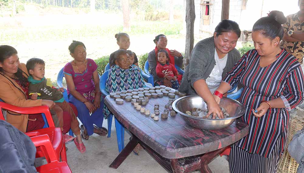 तालिम दिएको संस्थाले फर्मा र साबुन बनाउन आवश्यक सामग्री र दुई लाख लगानी गरेको छ । उनीहरूले साबुन बनाउन बुटवलबाट फर्मा ल्याएका थिए । ‘‘साबुन बनाउन मेहनत पर्छ, तीतेपाती टिप्न जानुपर्यो, केलाउनु पर्यो, पकाउनु पर्यो’’, सन्तोषीले भन्नुभयो । यहाँ उत्पादन गरिएको साबुन घाउ खटिरा, चिलाउने समस्या र छालाका लागि राम्रो हुने उनीहरूको भनाइ छ ।