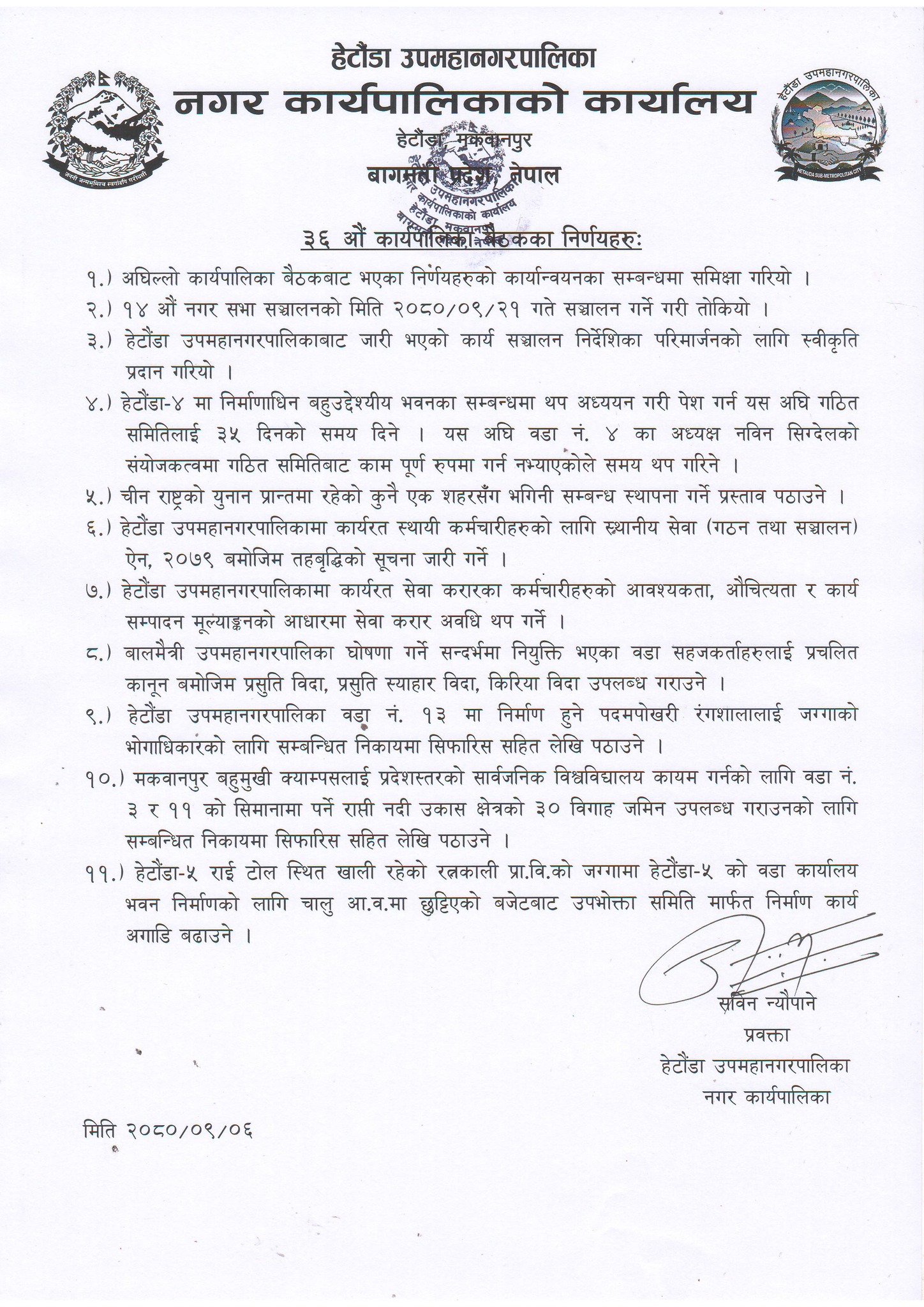 कार्यपालिका बैठकले अघिल्लो बैठकको समिक्षासहित १४ औं नगर सभा २१ पुसमा गर्ने निर्णय गरेको छ । उपमहानगरपालिकाबाट जारी भएको कार्य सञ्चालन निर्देशिका परिमार्जनको लागि स्वीकृति प्रदान गर्ने, हेटौंडा–४ मा निर्माणाधिन बहुउद्देश्यीय भवनका सम्बन्धमा थप अध्ययन गरी पेश गर्न यस अघि गठित समितिलाई ३५ दिनको समय दिने, चीन राष्ट्रको युनान प्रान्तमा रहेको कुनै एक शहरसँग भगिनी सम्बन्ध स्थापना गर्ने प्रस्ताव पठाउने, हेटौंडा उपमहानगरपालिकामा कार्यरत स्थायी कर्मचारीहरुको लागि स्थानीय सेवा (गठन तथा सञ्चालन) ऐन, २०७९ बमोजिम तहबृद्धिको सूचना जारी गर्ने निर्णय गरेको छ ।