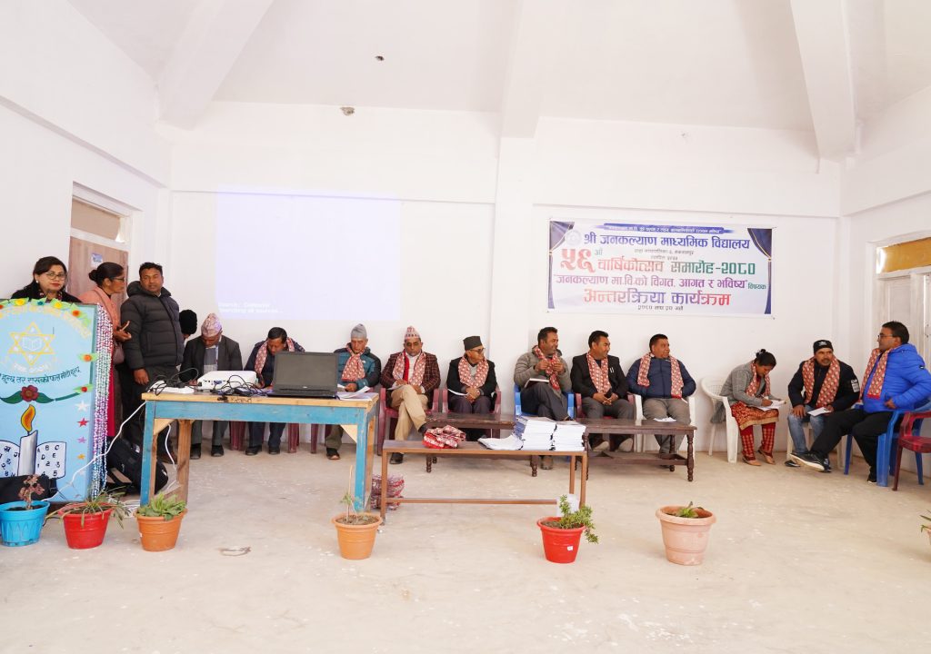 अन्तरक्रियामा हरिकृष्ण कार्की, रामहरी अधिकारी र रामकुमार बलले टिप्पणी सहित निष्कर्ष प्रस्तुत गरेका थिए । कार्यक्रममा विद्यालयका पूर्व व्यवस्थापन समिती अध्यक्ष सरोज कुमार खनाल र पुर्व विद्यार्थी बिष्णुहरी ढकाल जंगलीले जनकल्याणको विगतको स्मरण गराएका थिए । विद्यालय व्यवस्थापन समिति अध्यक्ष राजिव कुमार स्याङ्तानको अध्यक्षतामा भएको कार्यक्रममा पुर्व विद्यार्थी रामनारायण विडारी, थाहा नगरपालिकाका उपप्रमुख भरत गोपाली, पुर्वव्यवस्थापन समितिको अध्यक्ष तथा नारायणी यातायात व्यावसायि संघका महासचिव सरोज कुमार खनाललगायत पुर्व विद्यार्थी तथा पुर्व शिक्षक, पुर्व व्यवस्थापन समितिका पदाधिकारीहरुको उपस्तिथि रहेको थियो ।