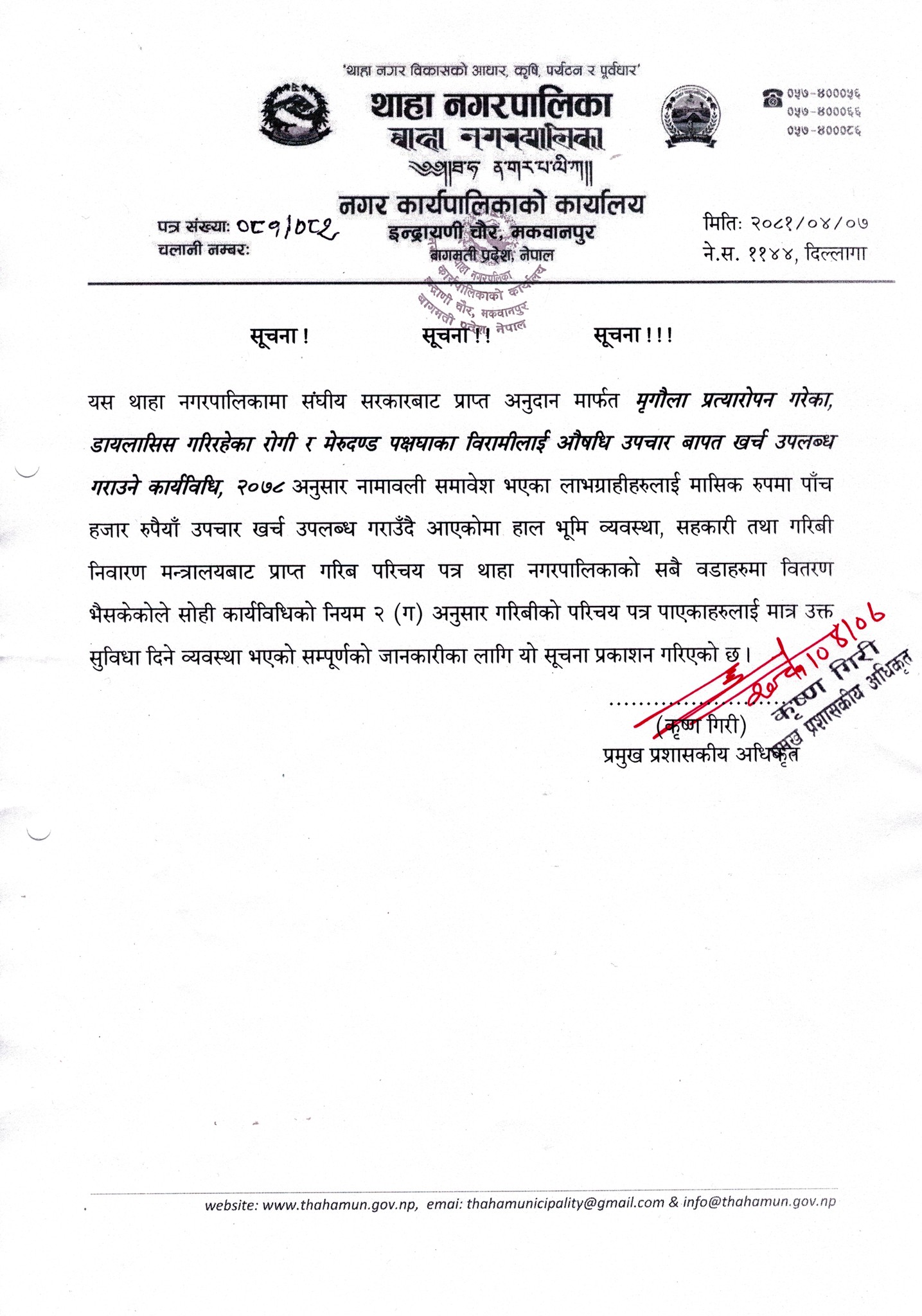संघीय सरकारले मृगौला प्रत्यारोपन गरेका, डायलासिस गरिरहेका रोगी र मेरुदण्ड पक्षघातका विरामीलाई औषधि उपचार वापत खर्च उपलब्ध गराउने कार्यविधि, २०७८ अनुसार मासिक ५ हजारका दरले उपचार खर्च उपलब्ध गराउँदै आएको छ । सोही कार्यत्रविधिको नियम २ (ग) अनुसार गरिबीको परिचयपत्र पाएकाहरुलाई मात्र उक्त सुविधा दिन सकिने व्यवस्था गरेको भन्दै थाहा नगरपालिकाले सार्वजनिक सूचना समेत गरेको छ । ‘थाहा नगरपालिकामा गरिब परिचय पत्र वितरण भैसकेको छ अब सोही बमोजिम कार्यविधिलाई टेकेर उपचार खर्च वितरण हुन्छ’–स्वास्थ्य शाखा प्रमुख मेघराज बलामीले भने ।