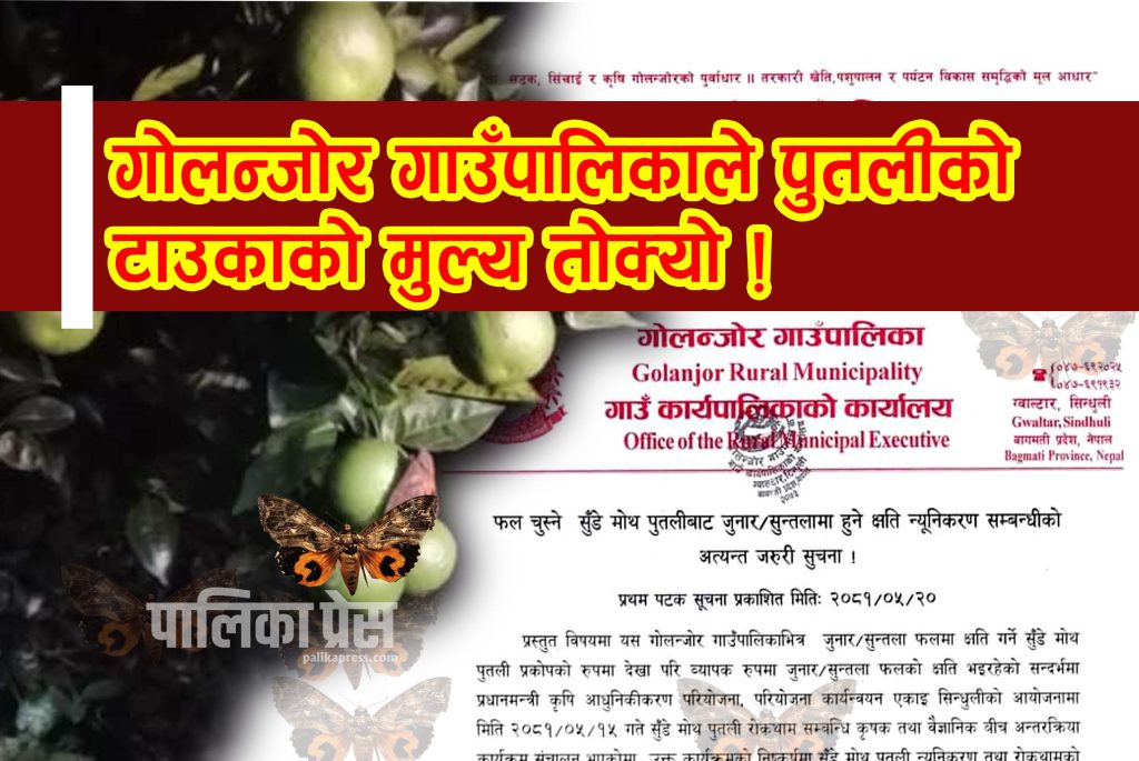 जुनारको राजधानी भनेर परिचय स्थापित गरेको सिन्धुलीको गोलन्जोर गाउँपालिकाले सुन्तला तथा जुनारको फल चुस्ने सुँडे मोथ पुतलीबाट जोगाइ क्षति न्यनिकरणका लागि नयाँ विधि अपनाएको छ । पुतलीबाट क्षति हुने दरले प्रकोपकै रुप लिएपछि पालिकाले पुतली समान्ते र मार्ने उपाय निकालेको हो । १५ भाद्रमा गोलन्जोर ५ खनियाखर्कमा सुँडे मोथ पुतली रोकथाम तथा नियन्त्रण सम्बन्धी कृषक र बैज्ञानिक बीच अन्तरक्रिया कार्यक्रमबाट यस्तो निष्कर्ष निकालिएको हो ।