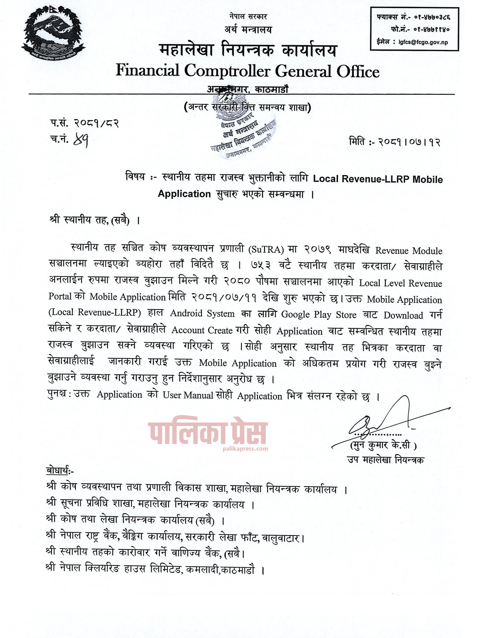 देशभरका सबै स्थानीय तह (पालिका)हरुमा अब मोबाइल एप्लिकेशनबाटै राजश्व भुक्तानी गर्न सकिने भएको छ । राजश्व भुक्तानीका लागि ११ कार्तिकबाट मोबाइल एप्लिकेशन सञ्चालनमा ल्याइएको महालेखा नियन्त्रकको कार्यालयले १२ कार्तिकमा सुचना प्रकाशन गरी जानकारी गराएको छ ।