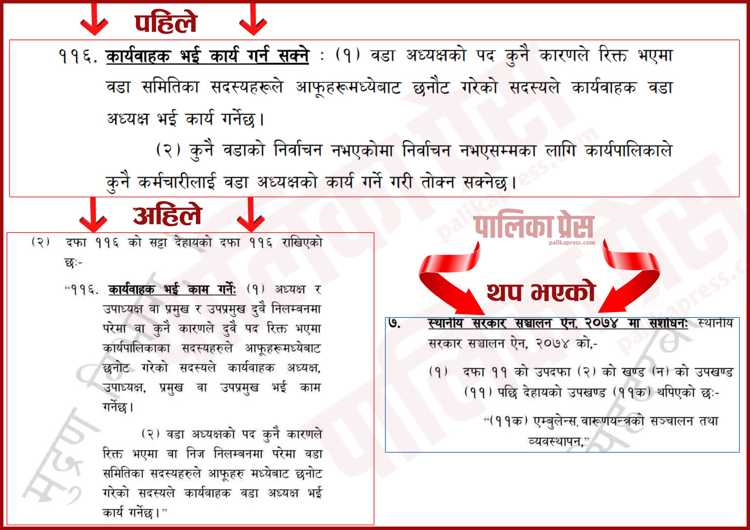 ऐनको दफा ११६ को सबै व्यवस्था संशोधन भएको छ भने दफा ११ को उपदफा (२) खण्ड (न) मा उपखण्ड (११) मा (११क) थपिएको छ । दफा ११६ (१) मा ‘अध्यक्ष उपाध्यक्ष वा प्रमुख उपप्रमुख दुवै निलम्बनमा परेमा वा कुनै कारण दुवै पद रिक्त भएमा कार्यपालिका सदस्यहरुले आफूमध्येबाट छनोट भएको सदस्यले कार्यबहाक अध्यक्ष, उपाध्यक्ष वा प्रमुख उपप्रमुख भई काम गर्ने छ’ भन्ने व्यवस्था राखिएको छ ।