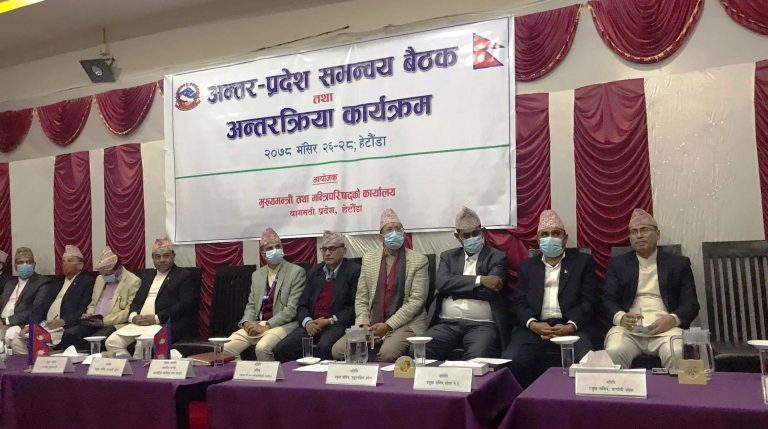 बागमती प्रदेशको राजधानी हेटौंडामा २६ मंसिरबाट अन्तर प्रदेश समन्वय बैठक तथा अन्तरकृया कार्यक्रम सुरु भएको छ । बागमती प्रदेश सरकारको आयोजनामा पहिलो पटक प्रदेशहरुका असल अभ्यास, संघीय सरकार र स्थानीय तहसँगको समन्वय, प्रेरणादायी कार्य र समस्या तथा चुनौतीहरुका बारेमा विस्तृत छलफल गरेर निष्कर्ष निकाल्ने उदेश्यका साथ कार्यक्रमको आयोजना गरिएको हो ।