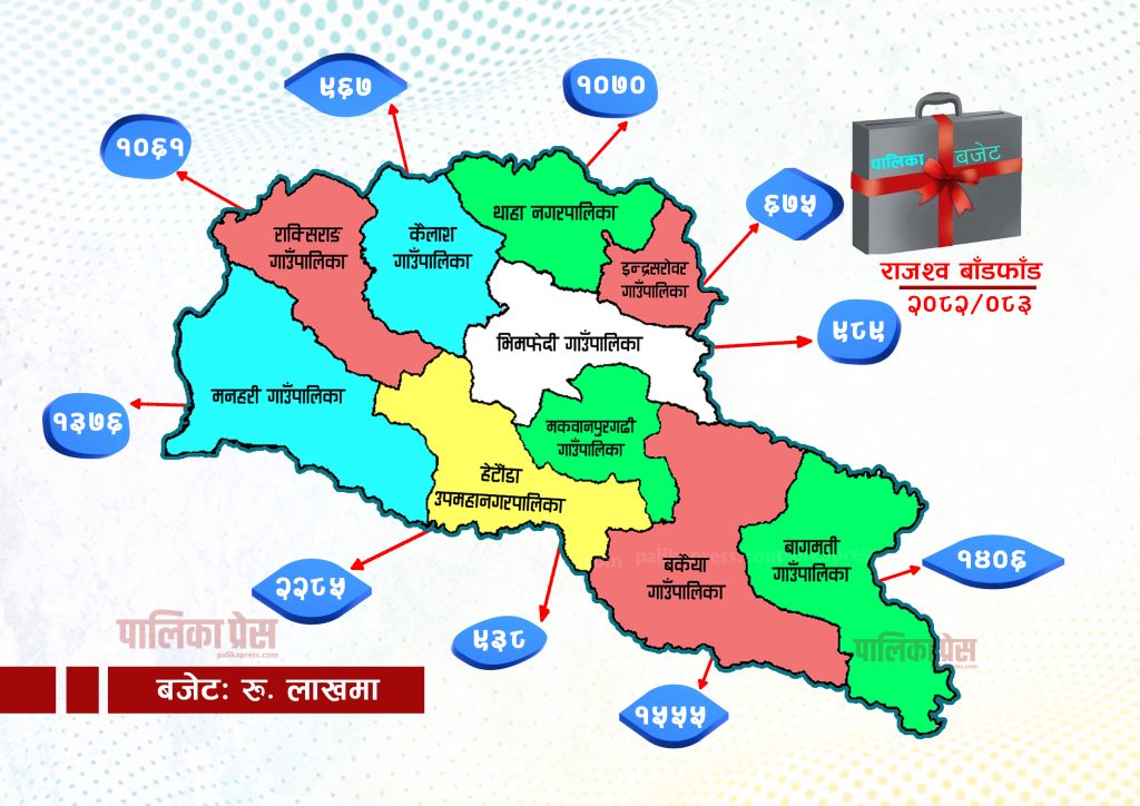 त्यसैगरी थाहा नगरपालिकाले १० करोड ७० लाख, कैलाश गाउँपालिकाले ९ करोड ६७ लाख, राक्सिराङ गाउँपालिकाले १० करोड ६१ लाख, मनहरी गाउँपालिकाले १३ करोड ७६ लाख रुपियाँ पाउने भएका छन् । भिमफेदी गाउँपालिकाले ९ करोड ८९ लाख, मकवानपुरगढी गाउँपालिकाले ९ करोड ३८ लाख, बकैया गाउँपालिकाले १५ करोड ५५ लाख र बागमती गाउँपालिकाले राजश्व बाँडफाँड मार्फत १४ करोड ६ लाख रुपैया बजेट पाउने भएका छन् ।