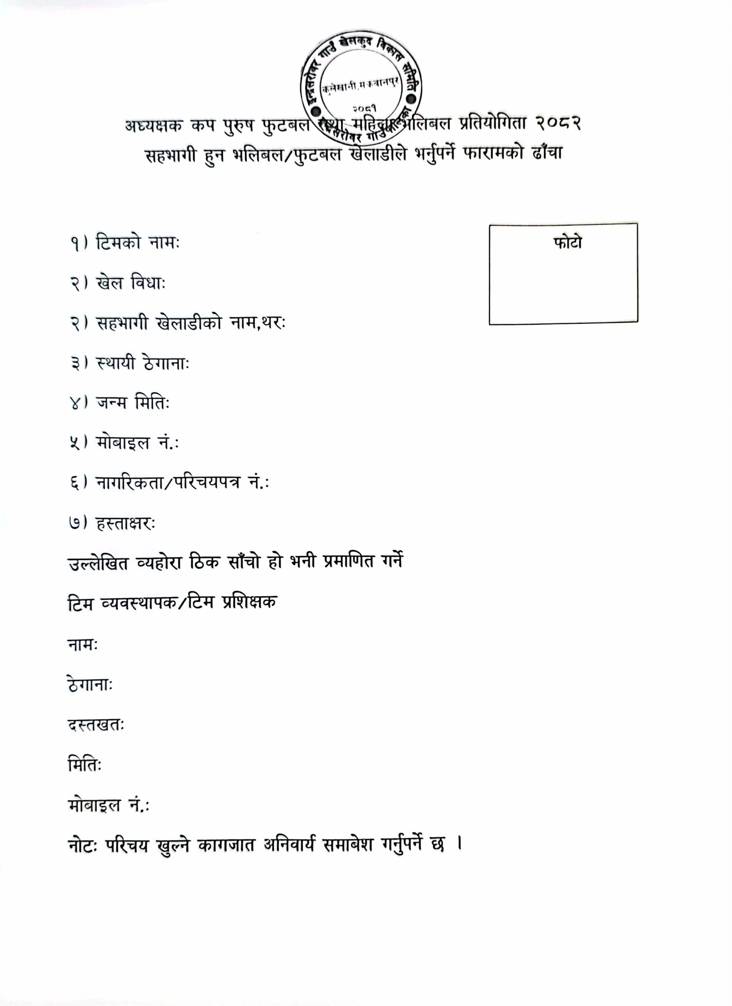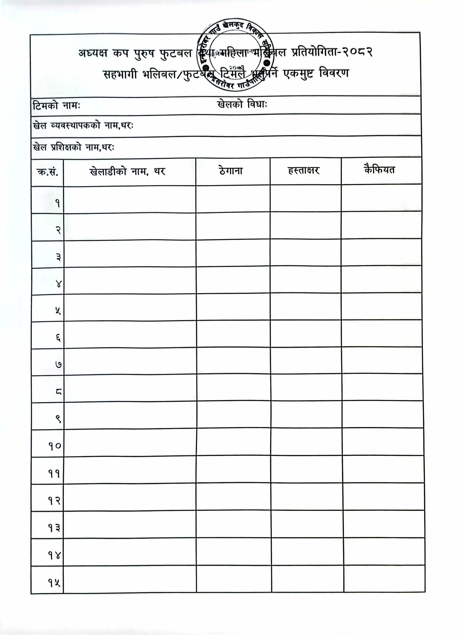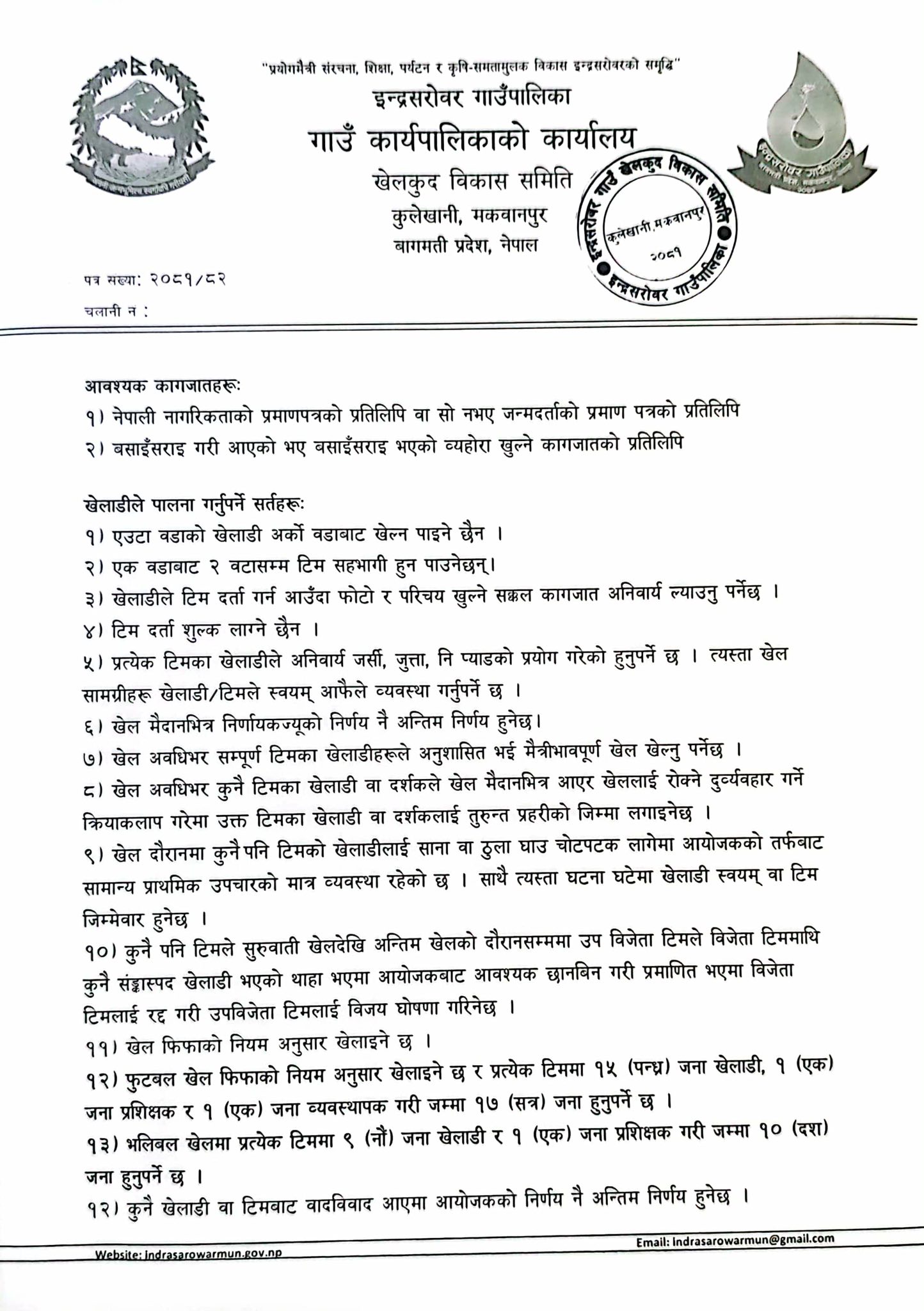 प्रतियोगिता इन्द्रसरोवर गाउँपालिका वडा नम्बर २ को हेवी खेल मैदानमा हुने भएको छ । प्रतियोगितामा भाग लिनका लागि १३ जेठमा सूचना प्रकाशन गरी समितिले आव्हान गरेको छ ।