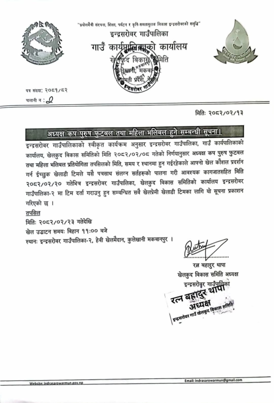 मकवानपुरको इन्द्रसरोवर गाउँपालिका खेलकुद विकास समितिको आयोजनामा ‘अध्यक्ष कप महिला भलिबल तथा पुरुष फुटबल प्रतियोगिता हुने भएको छ । खेलकुद विकास समिति इन्द्रसरोवरको ८ जेठको निर्णयानुसार २३ जेठबाट प्रतियोगिता हुने खेलकुद विकास समितिका अध्यक्ष रत्नबहादुर थापाले जानकारी दिए ।