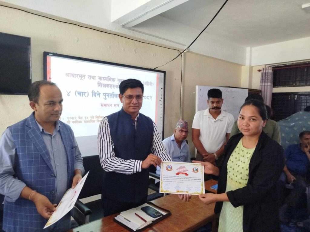 कैलाश गाउँपालिकामा कार्यरत अंग्रे्रेजी शिक्षकहरुलाई पुनर्ताजगी तालिम प्रदान गरिएको छ । गाउँपालिकाको आयोजनामा आधारभूत, निम्न र माध्यमिक विद्यालय तहका अंग्रे्रेजी शिक्षकहरुलाई चार दिने पुनर्ताजगी तालिम प्रदान गरिएको हो ।