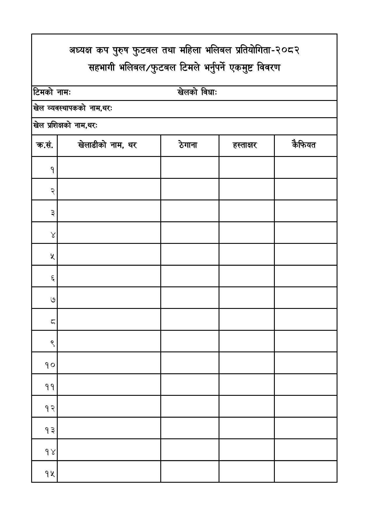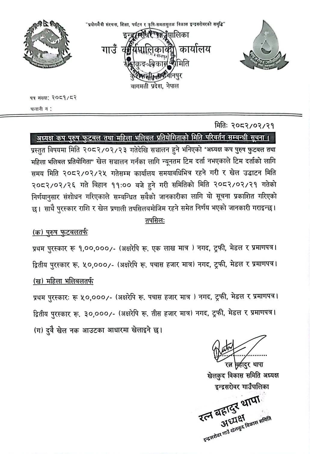 प्रतियोगिता इन्द्रसरोवर गाउँपालिका वडा नम्बर २ को हेवी खेल मैदानमा हुने भएको छ । प्रतियोगितामा भाग लिने टिमहरुले २५ जेठसम्म कार्यालय समयभित्र टिम दर्ता गर्नका लागि २१ जेठमै पुनः सूचना प्रकाशन गरिएको छ ।