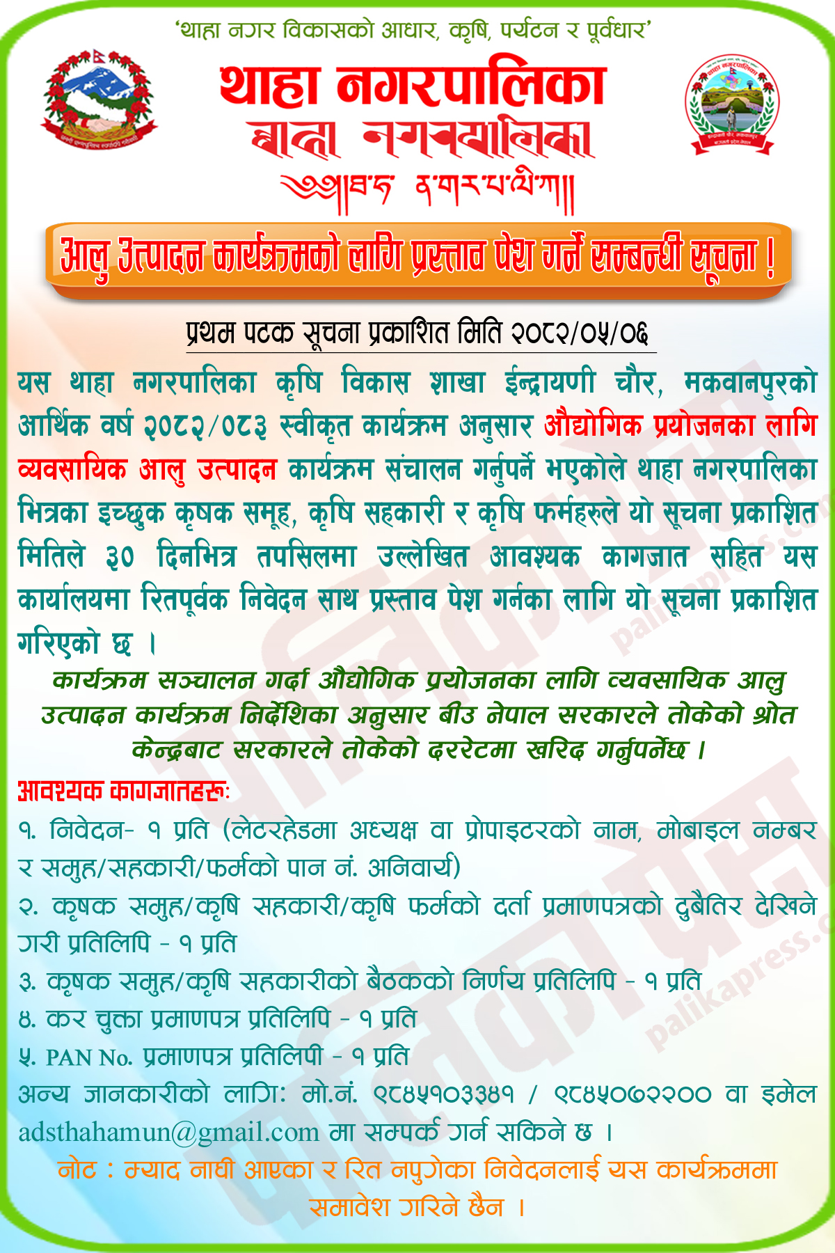 यसैबीच थाहा नगरपालिकाले औद्योगिक प्रयोजनका लागि व्यवसायिक आलु उत्पादन कार्यक्रमका लागि पनि प्रस्ताव आव्हान गरेको छ । यस कार्यक्रम सञ्चालन गर्न पनि ३० दिने म्याद दिएर ६ भाद्रमै सूचना आव्हान भएको छ ।