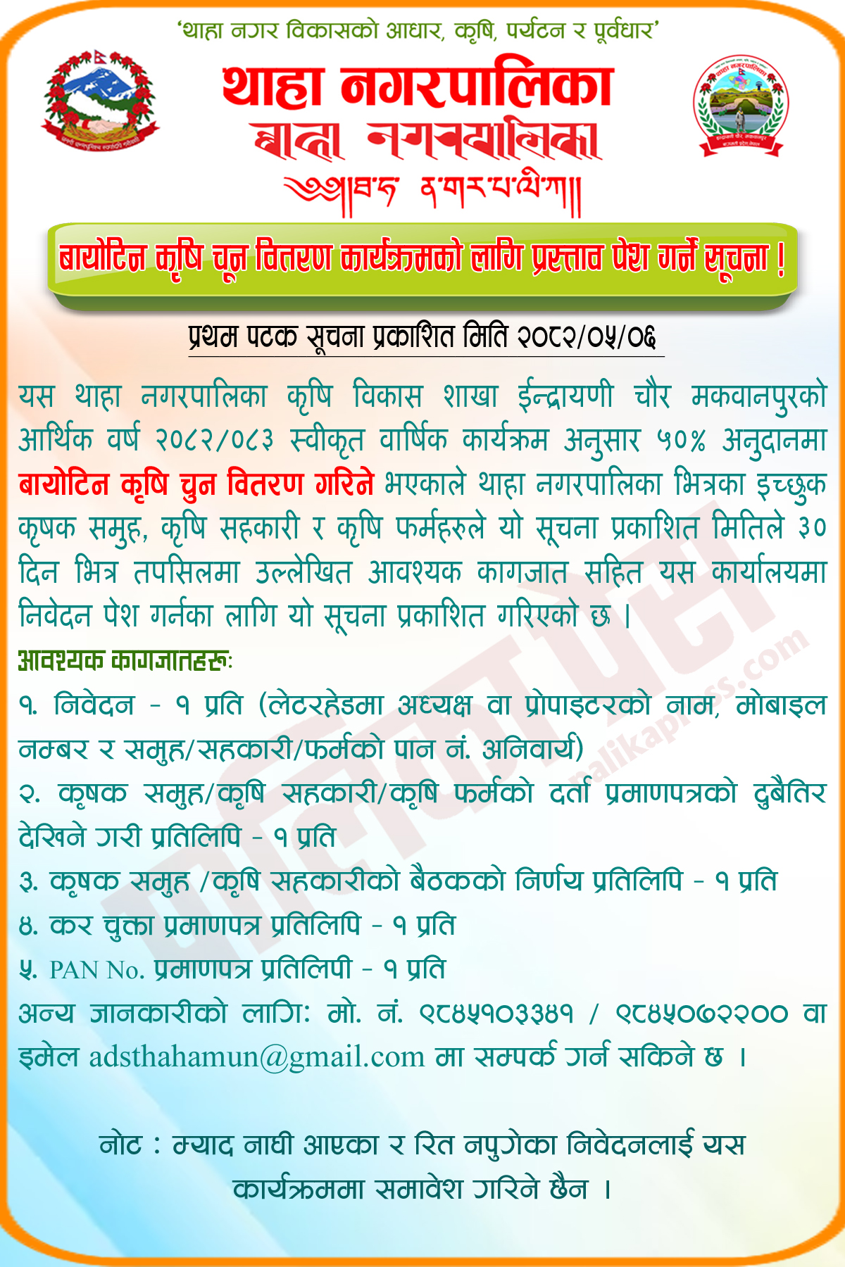 मकवानपुर थाहा नगरपालिकाले किसानहरुलाई बायोटिन चूनमा ५० प्रतिशत अनुदान दिने भएको छ । नगरपालिकाको कृषि विकास शाखाले ६ भाद्रमा सूचना प्रकाशन गरी अनुदानका लागि प्रस्ताव आव्हान गरेको हो ।