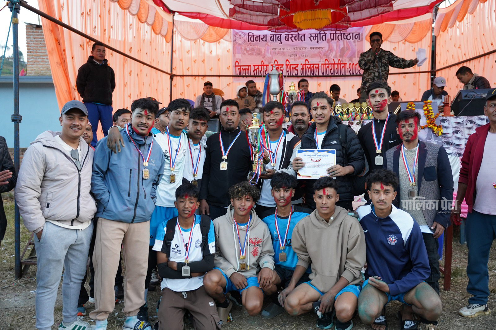 उपविजेता आयोजक विनयबाबु प्रतिष्ठानका खेलाडीहरु साथमा अतिथीहरु । फोटो श्रीकृष्ण श्रेष्ठ/पालिका प्रेस