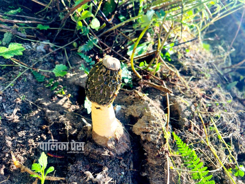 दामनमा भेटिएको दुर्लभ “गुच्ची च्याउ” । फोटो सौजन्यः सुरथ अधिकारी/पालिका प्रेस