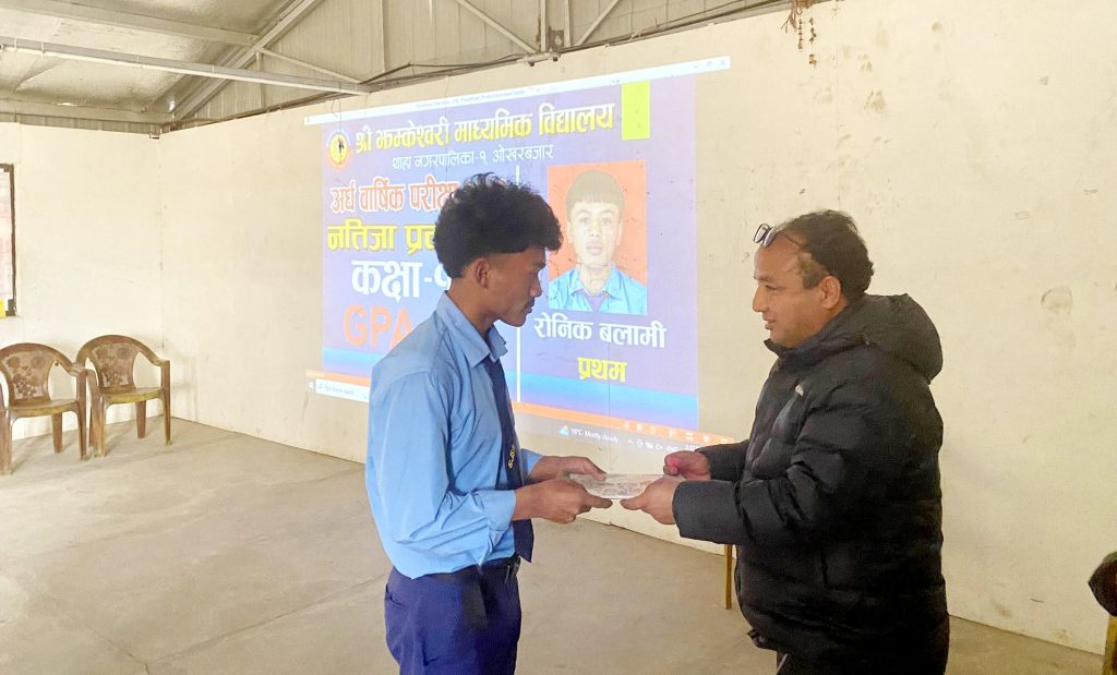 मकवानपुर थाहा नगरपालिकाको झम्केश्वरी माध्यमिक विद्यालयले अर्धवार्षिक परीक्षा, २०८२ को नतिजा प्रकाशन, अभिभावक भेला तथा अन्तक्र्रिया कार्यक्रम भव्य रूपमा सम्पन्न गरेको छ । शैक्षिक गुणस्तर अभिवृद्धि र प्रविधिमैत्री शिक्षण प्रणालीलाई प्राथमिकता दिँदै आएको विद्यालयले यस वर्ष थाहा नगरपालिकामै पहिलो पटक विद्यार्थीहरूको फोटो, नाम र ग्रेडसहित डिजिटल रूपमा नतिजा सार्वजनिक गरेर नयाँ अभ्यासको सुरुवात गरेको हो । डिजिटल माध्यमबाट सार्वजनिक गरिएको नतिजाले पारदर्शिता, विश्वसनीयता र सहज पहुँच सुनिश्चित गरेको भन्दै कार्यक्रममा सहभागी अभिभावक तथा विद्यार्थीहरूले खुसी र उत्साह व्यक्त गरेका थिए । यस अभ्यासले विद्यालयप्रति अभिभावकको विश्वास अझ बलियो बनाएको उनीहरूको धारणा थियो ।