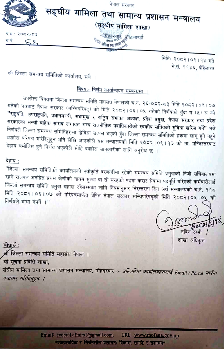 संघीय मामिला तथा सामान्य प्रशासन मन्त्रालयले राष्ट्रपति, उपराष्ट्रपति, प्रधानमन्त्रीलगायत उच्च तथा राजनीतिक पदाधिकारीका स्वकीय सचिवको सुविधा खारेज गर्ने मन्त्रिपरिषद्को निर्णय जिल्ला समन्वय समिति (जिसस)मा लागू नहुने स्पष्ट गरेको छ । मन्त्रालयले सबै जिल्ला समन्वय समितिको कार्यालयलाई परिपत्र जारी गर्दै नेपाल सरकारको २०८२ असोज १० गतेको निर्णय जिल्ला समन्वय समितिको हकमा कार्यान्वयन नहुने जानकारी गराएको हो। यसअघि उक्त निर्णयलाई आधार मानेर केही जिल्ला समन्वय समितिमा स्वकीय सचिवको सुविधा खारेज गर्नुपर्ने भन्दै अन्योल सिर्जना भएको थियो।