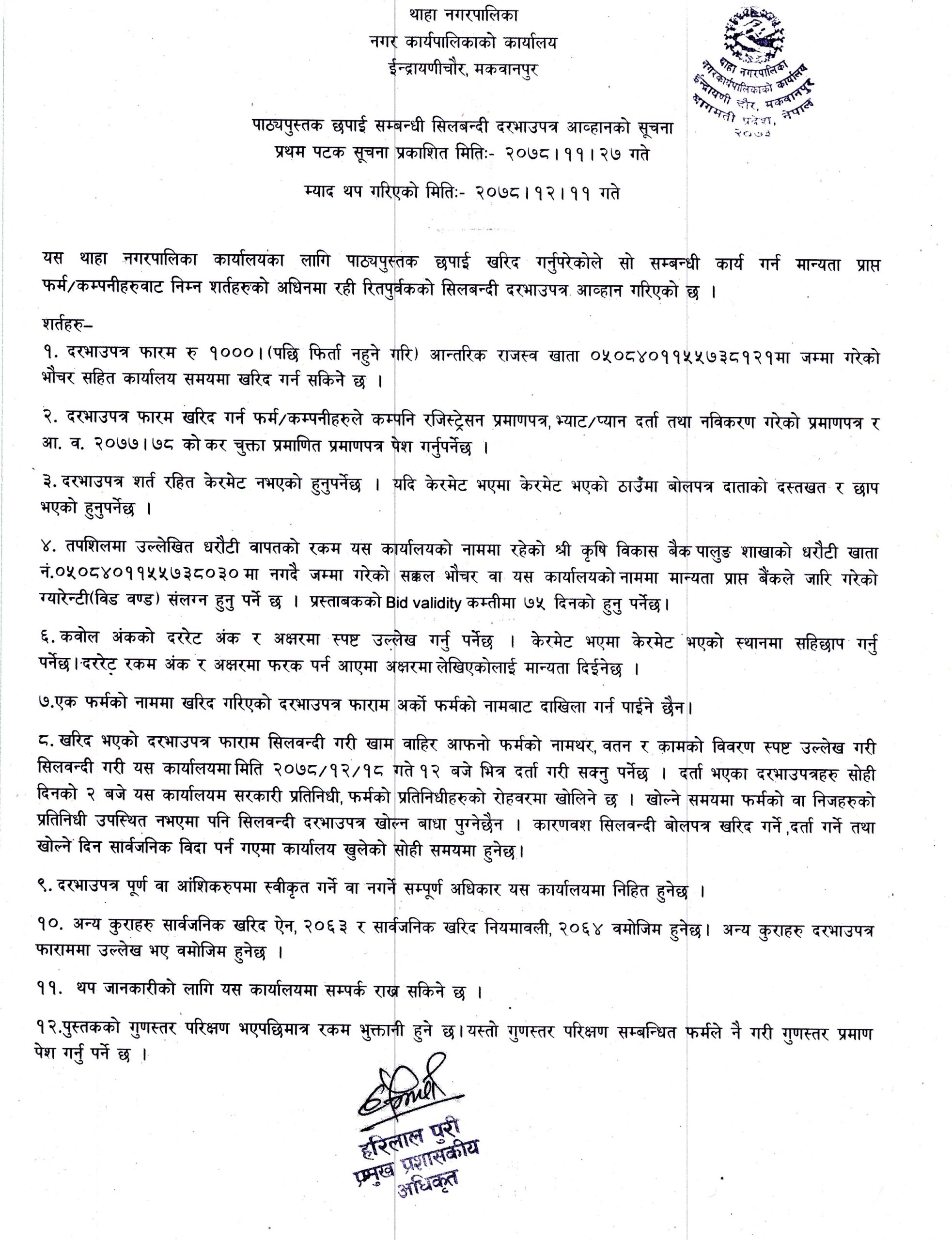 सूचना अनुसार मान्यता प्राप्त फर्म/कम्पनीहरुबाट सूचनामा उल्लेखित शर्तहरुको अधिनमा रही रितपुर्वकको सिलबन्दी दरभाउपत्र आव्हान गरेको छ । सूचनामा विभिन्न १२ वटा शर्तहरु राखिएको छ । पुस्तकको गुणस्तर परीक्षण भएपछिमात्र रकम भुक्तानी हुने र यस्तो गुणस्तर परीक्षण सम्बन्धित फर्मले परीक्षण गरी पेश गरे पश्चात् मात्र भुक्तानी हुने सम्मको शर्तहरु राखिएको छ । नै गरी गुणस्तर प्रमाण पेश गर्नु पर्ने छ ।