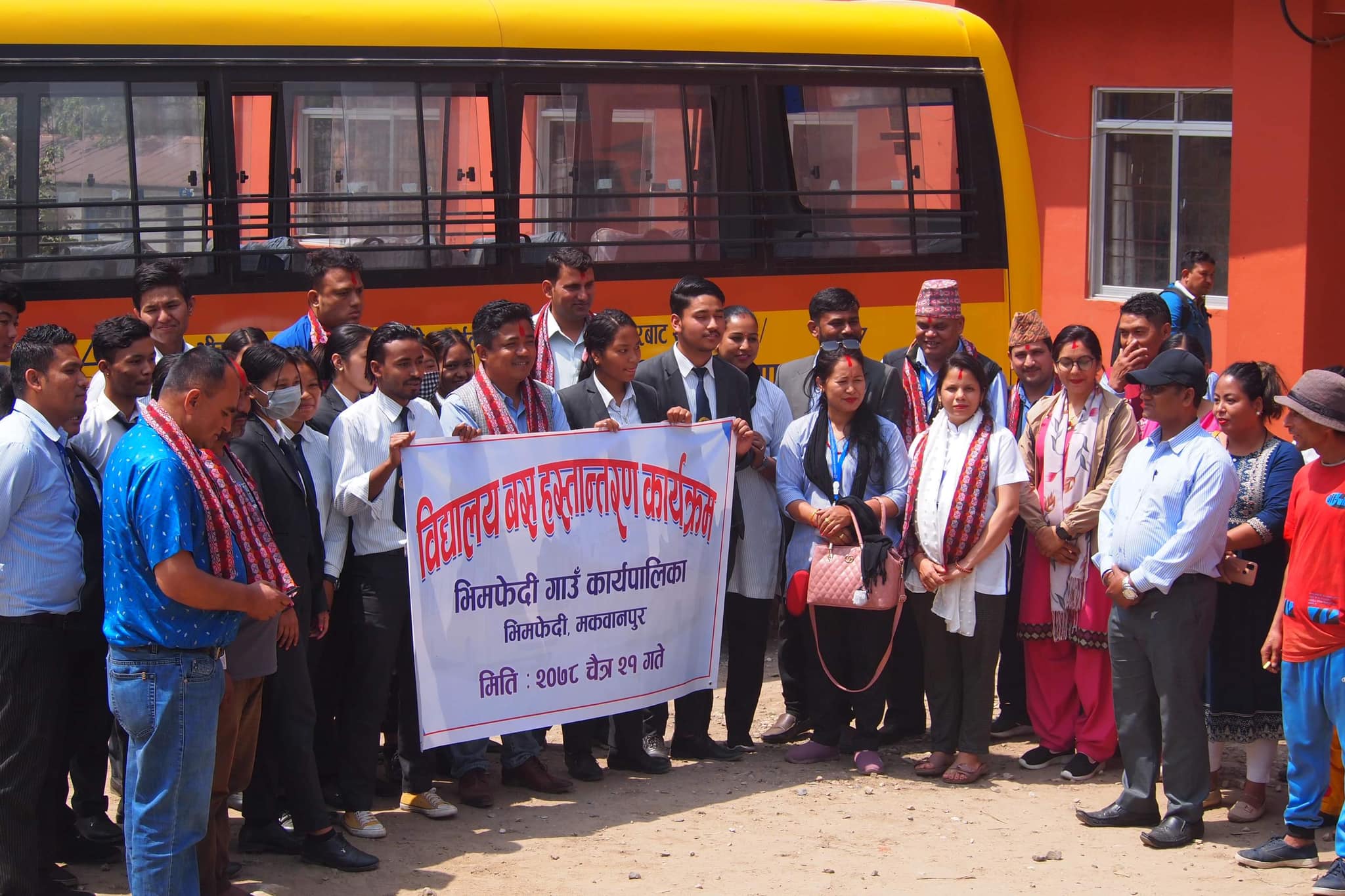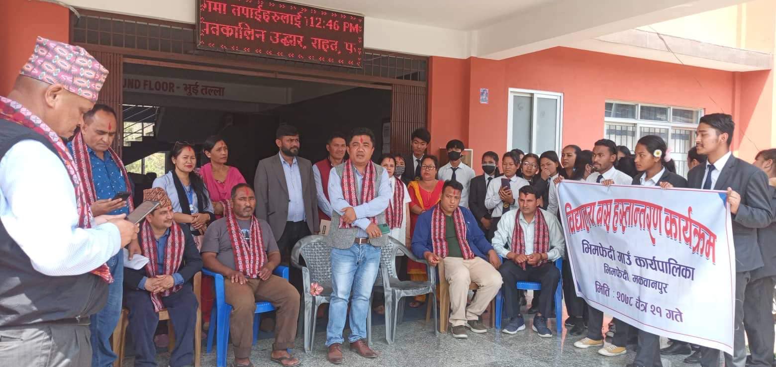 मकवानपुरको भिमफेदी गाउँपालिकाले श्री कृष्ण माध्यमिक विद्यालयलाई ‘स्कूल बस’ हस्तान्तरण गरेको छ । पालिकाको वडा नम्बर २ भैसेमा रहेको उक्त विद्यालयलाई पालिका कार्यालय भिमफेदीमा एक कार्यक्रमको आयोजना गरी ‘स्कूल बस’ हस्तान्तरण गरिएको हो । कार्यक्रममा गाउँपालिका अध्यक्ष हिदम लामाले विद्यालयका प्रधानाध्यापक कृष्णलाल श्रेष्ठलाई बसको चाबी हस्तान्तरण गरेका हुन् ।