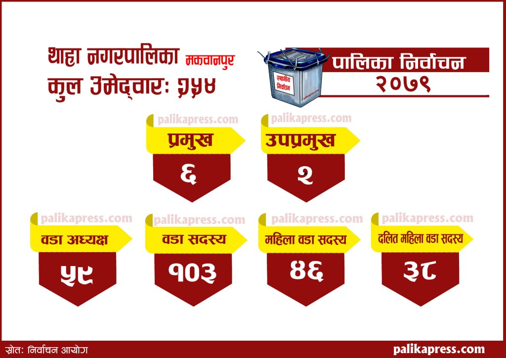 थाहा नगरपालिकाको प्रमुख पदमा ६ जनाको उमेद्वारी परेको छ भने उपप्रमुख पदमा २ जनाको मात्र उमेद्वारी दर्ता भएको छ ।