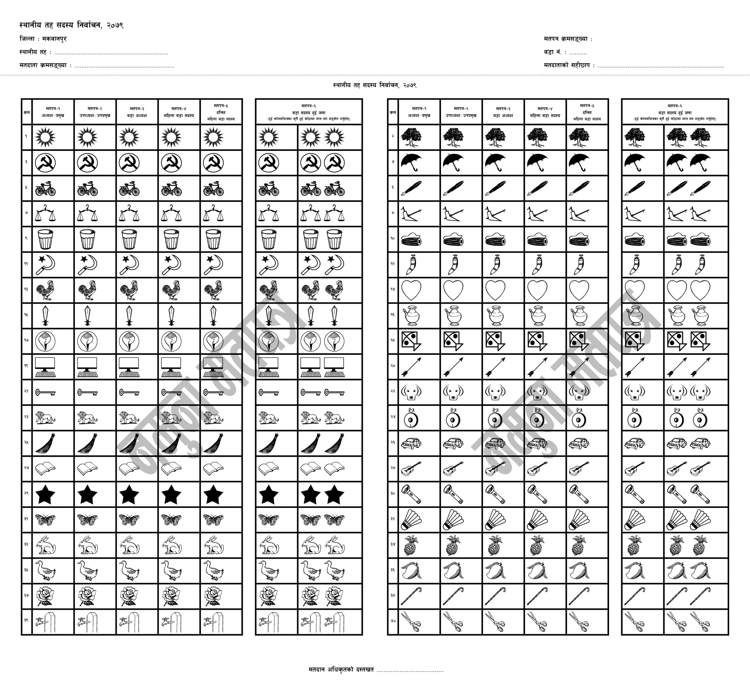 ३० वैशाखमा हुने स्थानीय तह सदस्य निर्वाचनका लागि आयोगले जिल्लापिच्छे नै फरक फरक चुनाव चिन्ह सहितको मतपत्र सार्वजनिक गरेको हो ।