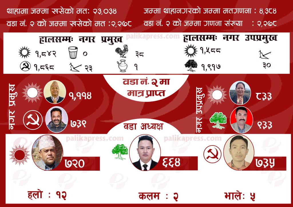 थाहा–२ मा माओवादीको प्यानलै विजयी भएको छ । माओवादीको तर्फबाट खुल्ला वडा सदस्यहरुमा विजयी युवराज विष्टले ६१३ र अर्जुन कार्कीले ५९६ विजयी मत पाएका छन् । त्यसैगरी महिला सदस्यमा रितु कार्कीले ६७७ र दलित महिला सदस्यमा सिर्जना विकले ६५२ मतसहित विजयी भएका छन् ।