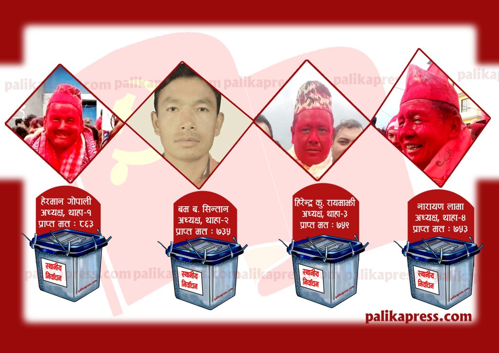 नेकपा माओवादीको लाल किल्ला भनिदै आएको वडा नम्बर ४ को अध्यक्षमा नारायण लामा विजयी भएका छन् । उनले निकटतम प्रतिद्वन्द्धी नेकपा एमालेका रामराजा केसीलाई २ सय ४१ मतान्तरले पराजित गरे । लामाले ७ सय ७३ र केसीले ५ सय १२ मत पाए । यसअघि ०७४ सालको चुनावमा ४ नम्बर वडामा माओवादीका दिपक सिं लामाले ४ सय ६३ मतान्तरले एमालेका अच्युत केसीलाई पराजित गरेका थिए । अध्यक्षका उमेद्वार लामाले त्यसबेला ८ सय ८ र एमालेका केसीले ३ सय ४५ मात्र मत पाएका थिए ।