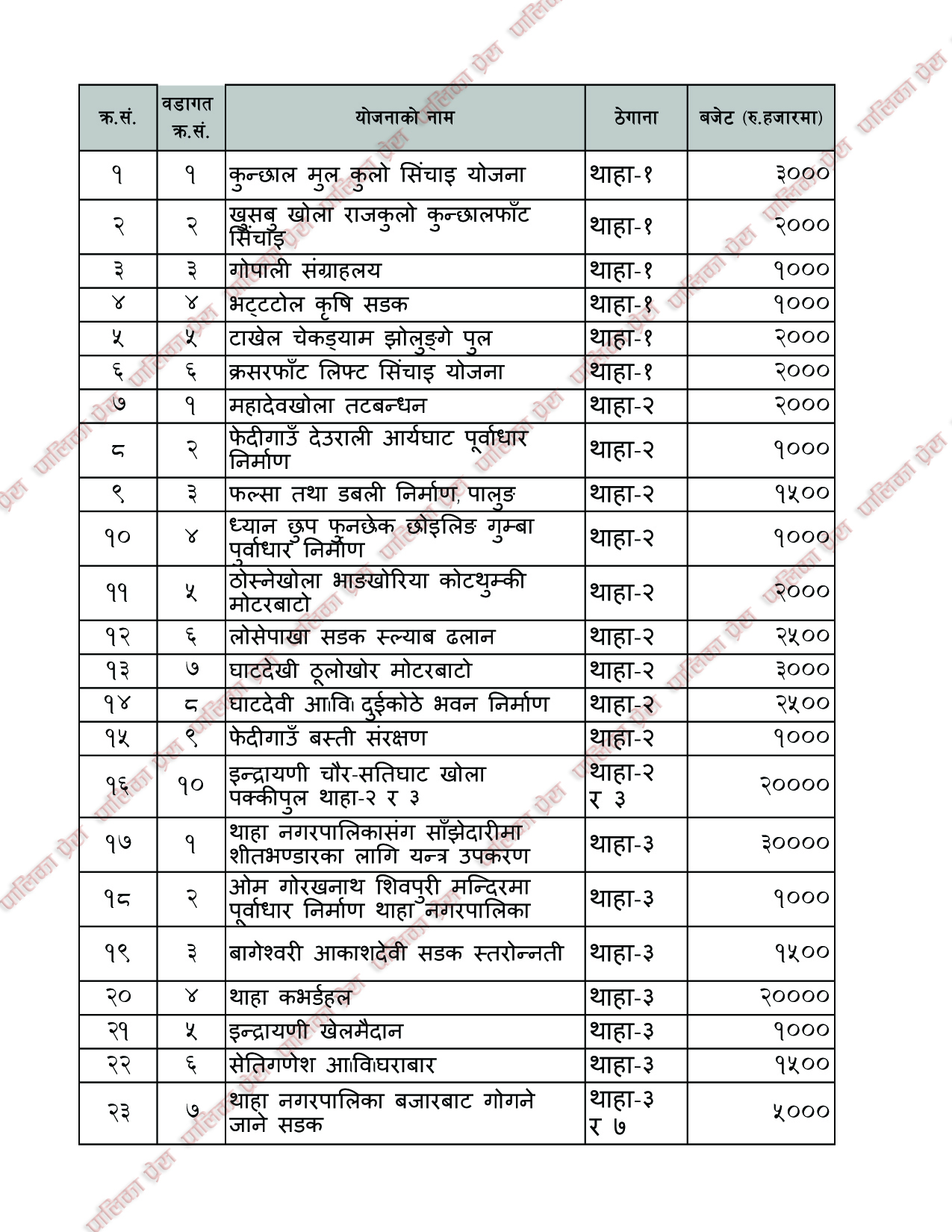 थाहा नगरपालिका क्षेत्रमा संचालन हुने योजनाहरुका लागि ४४ करोड २५ लाख रुपियाँ बजेट विनियोजन भएको आर्थिक मामिला तथा योजना मन्त्रालय बागमती प्रदेशले जनाएको छ । थाहानगरमा सबैभन्दा कम थाहा–५ मा एउटा योजना र सबैभन्दा बढि वडा नम्बर १२ मा १७ वटा योजनाको लागि बजेट विनियोजन भएको छ ।