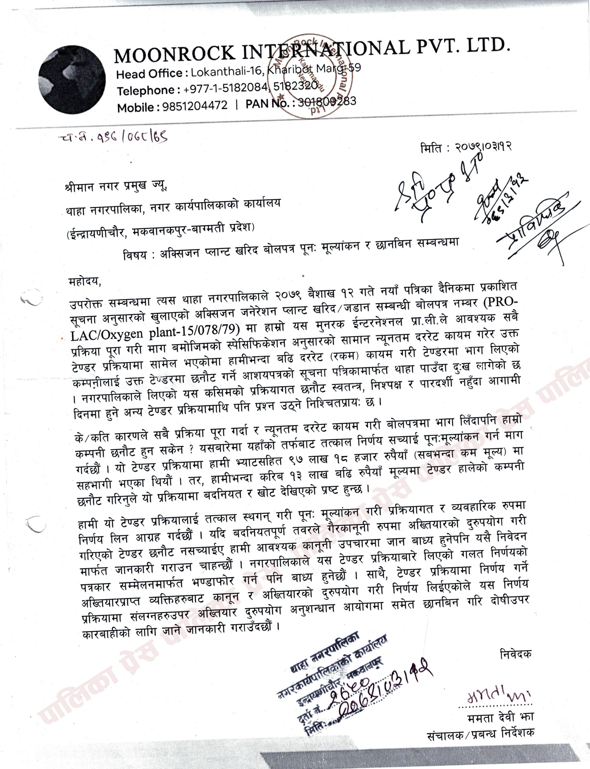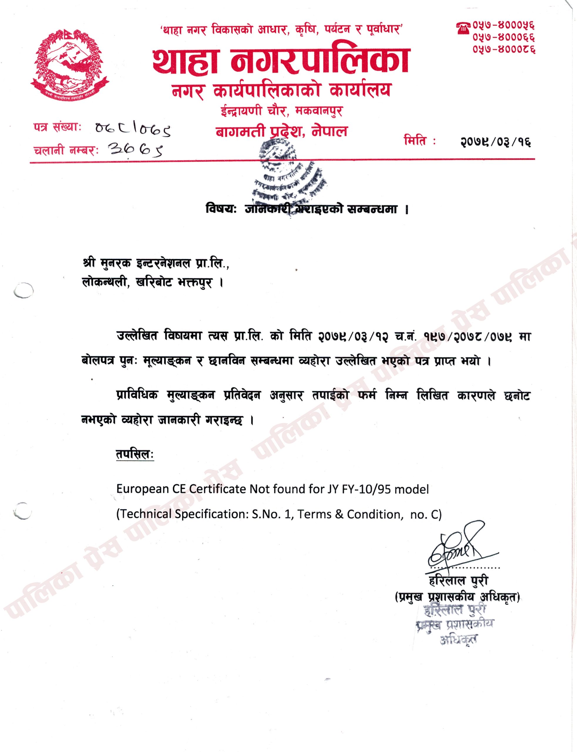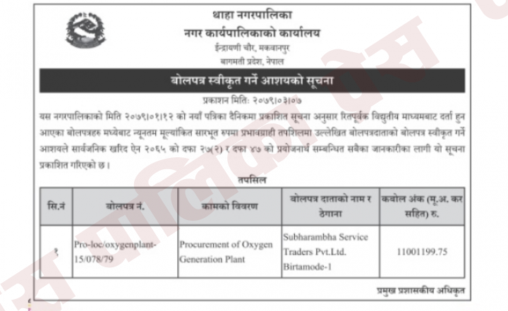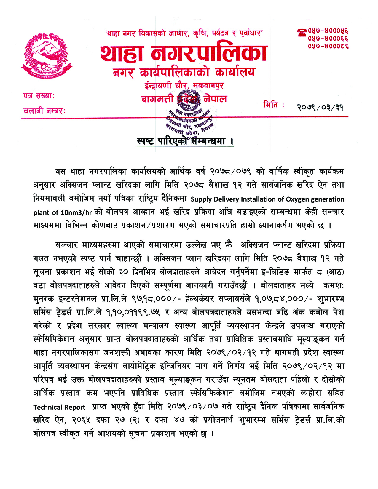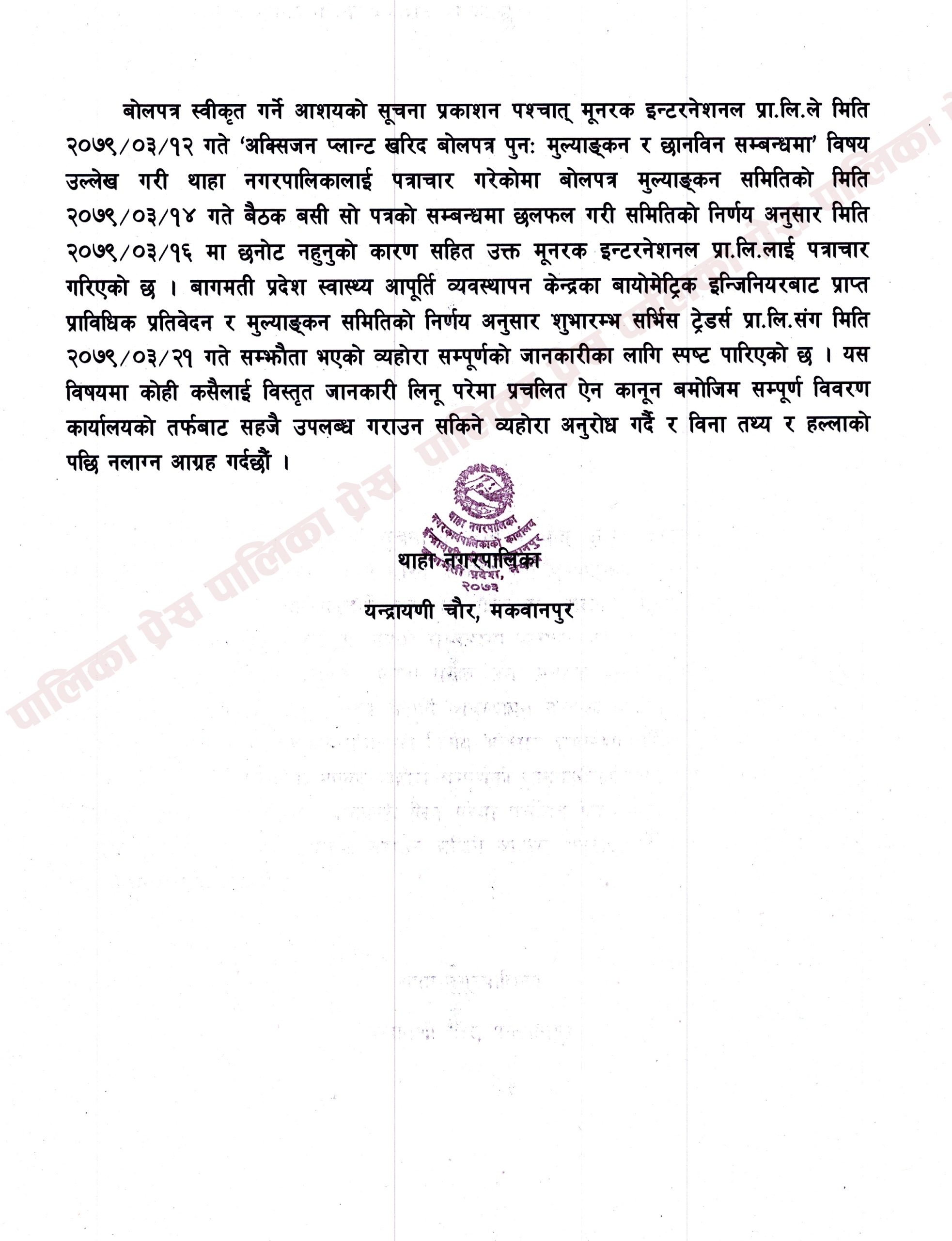 थाहा नगरपालिकाले १२ वैशाखमा सूचना प्रकाशन गरी बोलपत्र आव्हान गरेको थियो । पालिकाले सार्वजनिक खरिद ऐन तथा नियमावली बमोजिम खरिद प्रक्रिया अवलम्बन गरिएको बताउँदै प्रकाशित समाचारहरुप्रति ध्यानाकर्षण भएको जनाएको छ । थाहा नगरपालिकाले आफ्नो वेभसाइट मार्फत ३१ असारमा सूचना प्रकाशन गरी स्पष्ट पारेको हो ।