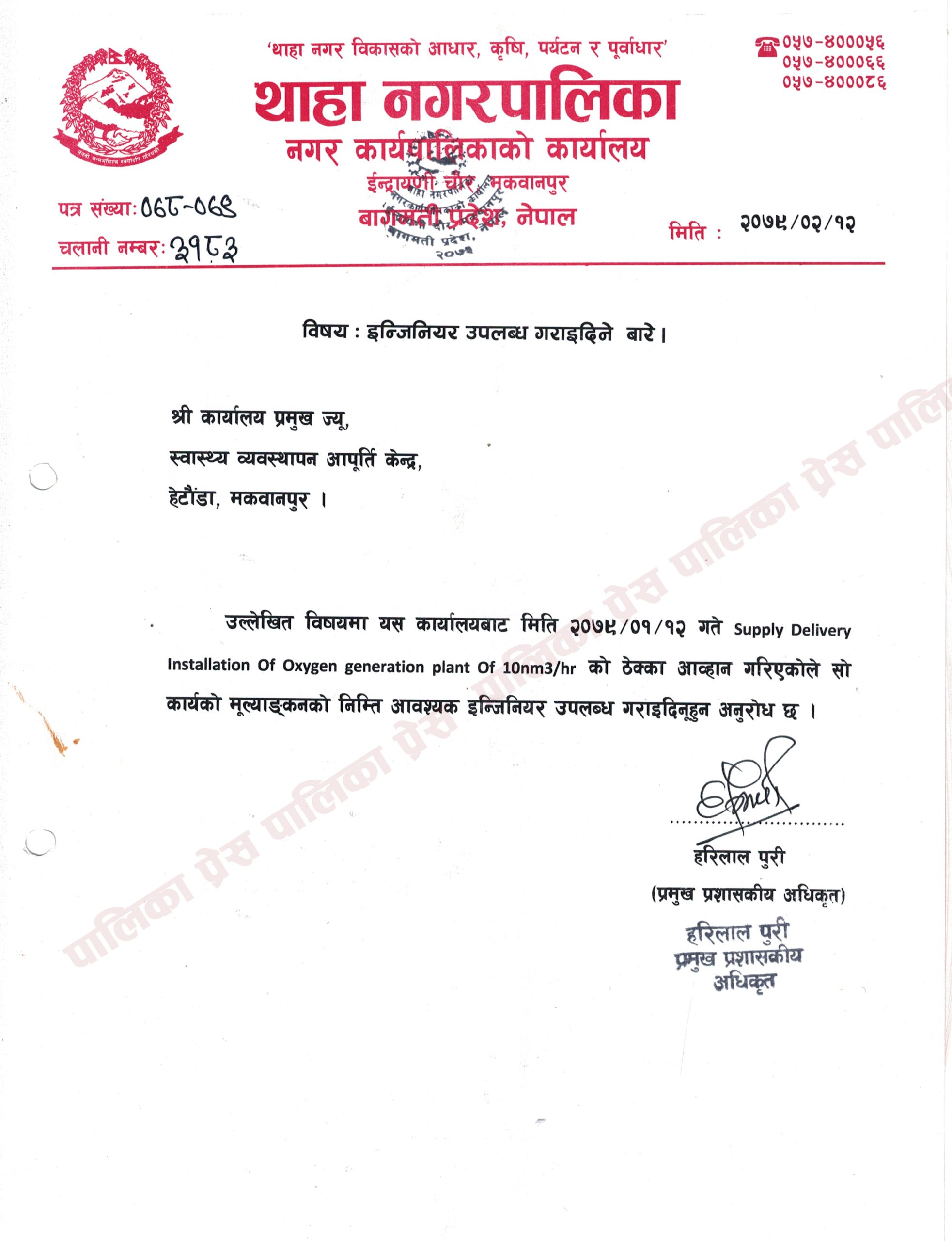 मकवानपुर यस थाहा नगरपालिका कार्यालयले अक्सिजन प्लान्ट खरिदमा गरेको टेण्डर प्रक्रियामा अनियमितता भएको भन्ने विषयमा केही सञ्चार माध्यममा आएको समाचारप्रति नगरपालिकाले ध्यानाकर्षण भएको जनाएको छ ।