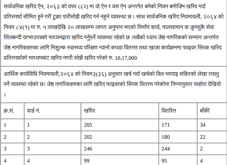 जेष्ठ नागरिकको सम्मान अन्तरगत फाइबर सिरक खरिद गर्दा पनि टेण्डर गर्नुको सट्टा सोझै खरिग गरेको महालेखा परिक्षकको कार्यालयले सार्वजनिक गरेको प्रतिवेदनमा उल्लेख छ । १० लाख १७ हजार रुपैयाँ लागतमा खरिद गरिएको सिरकमा पनि पुरै सिरक बितरण गरिएको भपाई नपाइएको महालेखाको प्रतिवेदनमा उल्लेख छ ।