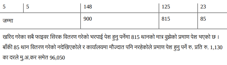 खरिद गरेका सिरक सबै जेष्ठ नागरिकले बुझेको भपाई पेस गर्नुपर्नेमा ८ सय १५ थान मात्र बुझेको भपाई पेस भएको र अरु ८५ थान सिरक जेष्ठ नागरिकले बुझेको भपाई पेस पनि नभएको र सिरक पनि गाउँपालिकासंग नभएको जनाएको छ । तर, बिल भने पुरै रकमको भएको पाइएको छ ।
