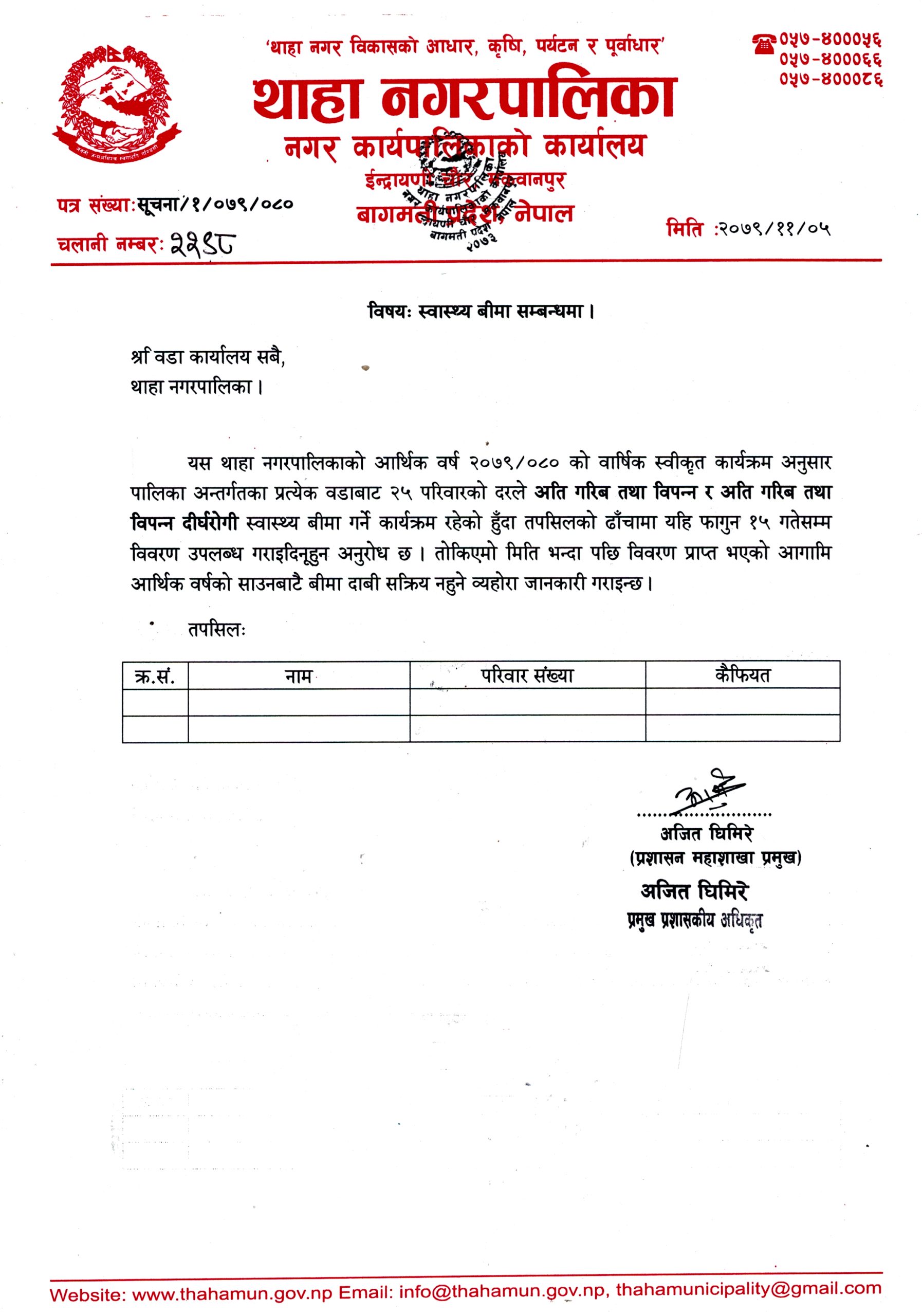 मकवानपुर थाहा नगरपालिकाले ३ सय परिवारको निःशुल्क स्वास्थ्य बीमा प्रक्रिया अघि बढाएको छ । थाहा नगरपालिकाको आर्थिक वर्ष २०७९÷०८० को वार्षिक स्वीकृत कार्यक्रम अनुसार अति गरिब तथा अति गरिव तथा विपन्न दीर्घरोगीहरुका लागि बीमा गर्ने प्रक्रिया अघि बढाइएको स्वास्थ्य शाखा प्रमुख मेघराज बलामीले जानकारी दिए ।