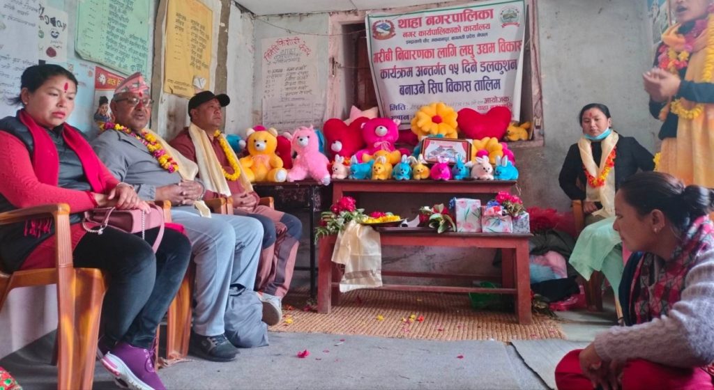 बुटवलबाट आएकी सरिता थापाले थाहा-३ का महिलाहरुलाई १५ दिनसम्म डल-कुशन बनाउने तालिम दिएकी थिइन् । थाहा नगरपालिकाले गरिबी निवारणका लागि लघु उद्यम विकास कार्यक्रमअन्तर्गत तालिम दिएकाे हाे । तालिममा महिलाहरुले गणेश, खरायाे, कुकुर र पेडीकाे डल बनाउन सिकेका छन् भने दुईथरी फूल र प्रेम(मुटु)काे कुशन बनाउन सिकेका छन् ।