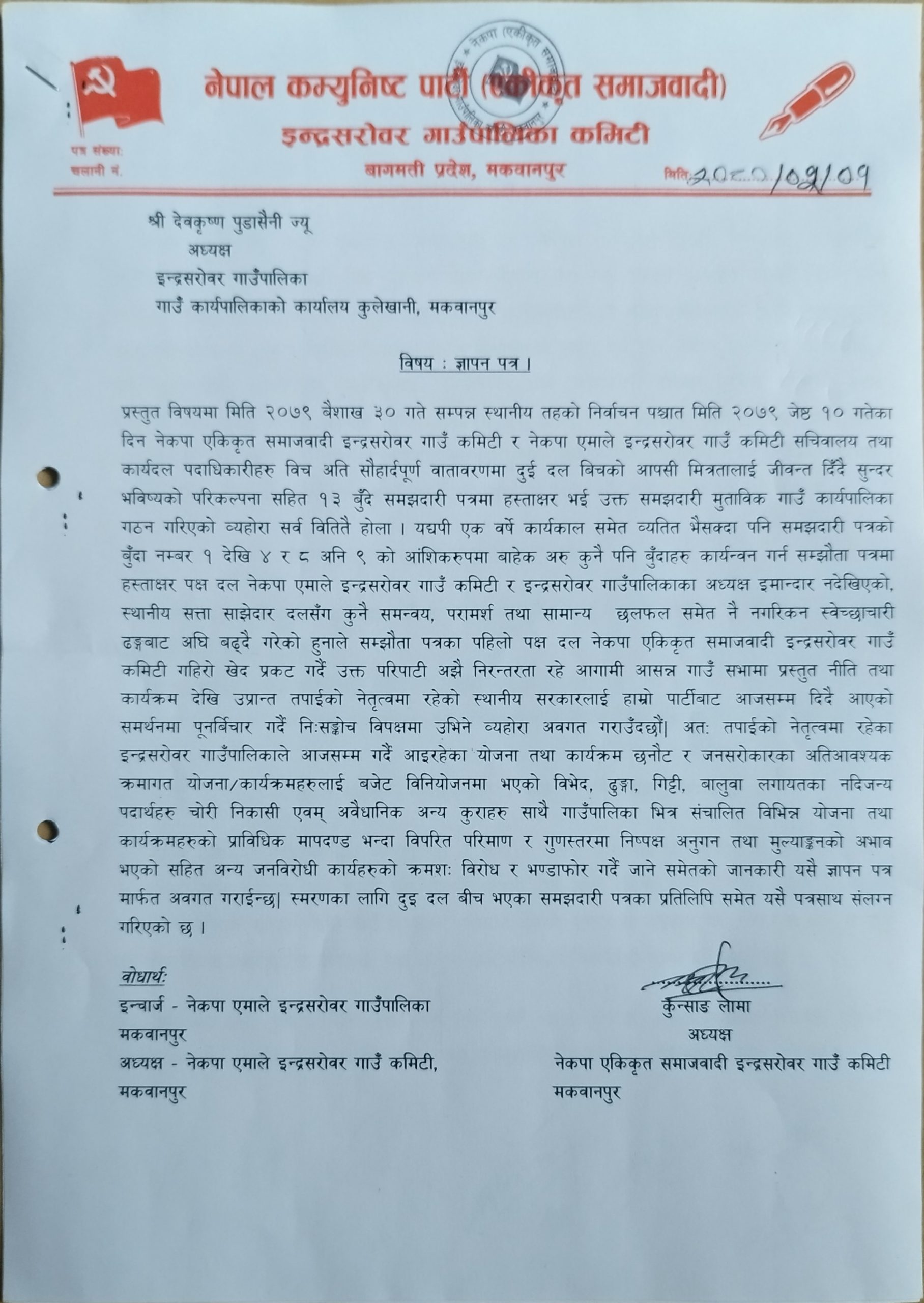 नेपाल कम्युनिस्ट पार्टी एकीकृत समाजवादी ( नेकपा एस) इन्द्रसरोवर गाउँ कमिटीले इन्द्रसरोवर गाउँपालिकाका अध्यक्ष देवकृष्ण पुडासैनीलाई १ असारमा ज्ञापनपत्र बुझाएका छन् । स्थानीय तहको दोस्रो कार्यकालका लागि भएको गाउँकार्यपालिकाको निर्वाचनका क्रममा नेपाल कम्युनिस्ट पार्टी एकीकृत समाजवादी इन्द्रसरोवर गाउँ कमिटी र नेकपा एमाले इन्द्रसरोवर गाउँपालिका कमिटि तथा कार्यदल बिचमा १३ बुँदे सहमति भएकोमा उक्त सहमतिलाई नेकपा एमाले र उक्त पार्टीबाट निर्वाचित गाउँपालिकाका अध्यक्षले कार्यन्वयनमा नल्याएइपछि वाध्य भएर यो कदम चाल्नु परेको नेकपा एकीकृत समाजवादी गाउँ पार्टी कमिटिका अध्यक्ष कुन्साङ लामाले बताए ।