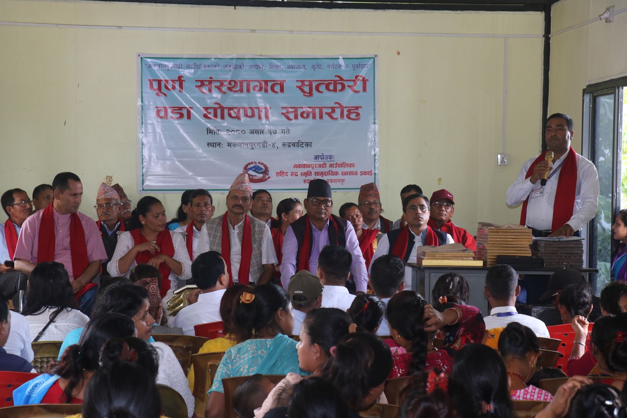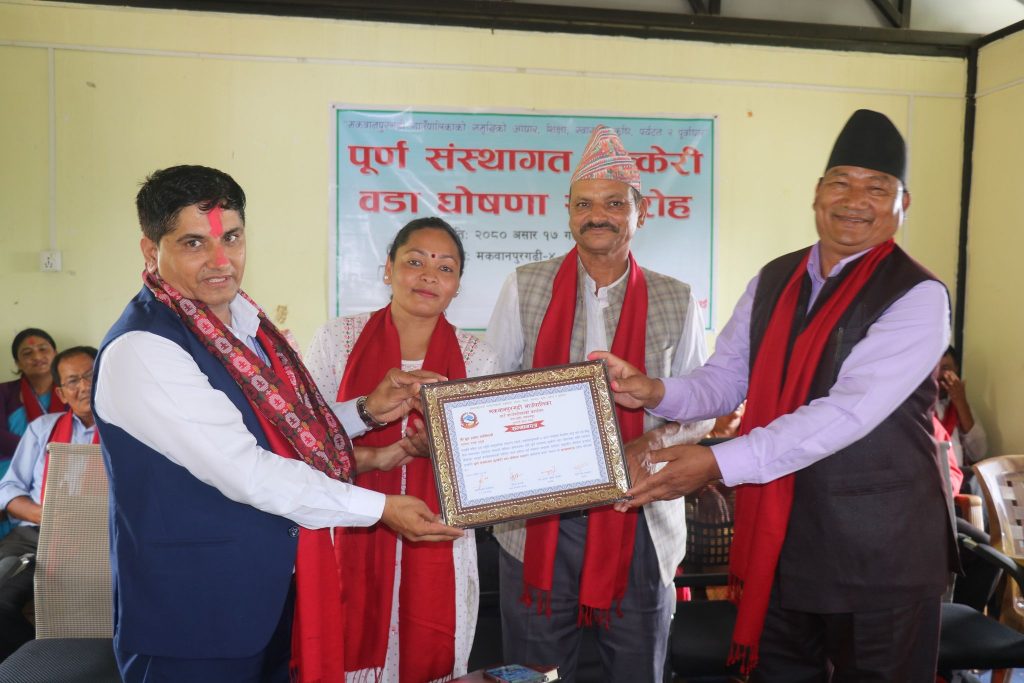 मकवानपुरगढी गाउँपलिकाको वडा नंम्बर ४ लाई पूर्ण संस्थागत सुत्केरी वडा घोषणा गरिएको छ । मकवानपुरको ८ गाउँपालिका मध्ये पूर्ण संस्थागत सुत्केरी वडा घोषणा गर्ने मकवानपुरगढी पहिलो गाउँपालिका हो । गाउँपलिकाका अध्यक्ष दोर्जे लामा स्याङतानले औपचारिक रूपमा ४ नम्बर वडालाई १७ असारमा पूर्ण संस्थागत सुत्केरी वडा घोषणा गरेका हुन् ।