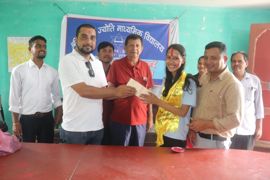 महेन्द्र ज्योतीबाट सर्वोत्कृष्ट नतिजा ३.१० जिपिए प्राप्त गर्न सफल प्रिन्सा पौडेललाई नगद रु १० हजार सहित प्रमाण पत्र प्रदान गरिएको थियो । त्यसैगरी २.९ जिपिए प्राप्त गर्न सफल निकिता तिमल्सीना र स्वस्तीका बर्तौलालाई क्रमश ४÷४ हजार नगदसहित सम्मान गरिएको थियो ।आगामी दिनमा उत्कृष्ट नतिजा ल्याउनेहरुलाई थप प्रेरणा र हौसलाका साथ पठनपाठन यात्रा अघि बढोस् भन्ने अभिप्रायले आफ्नो एक महिनाको पारिश्रमिक उपहार दिइएको वडाअध्यक्ष अर्यालको भनाई छ ।
