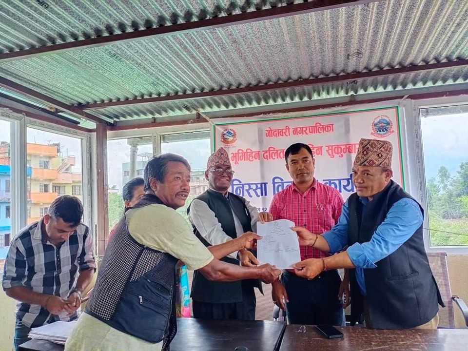 गोदावरी नगरपालिका–१२ ठेचोका सुकुम्वासीले लालपुर्जाको निस्सा पाएका छन् । भूमि आयोग ललितपुरले ठेचोका ५ जना भूमिहीन सुकुम्वासीहरुलाई निस्सा वितरण गरेको हो ।