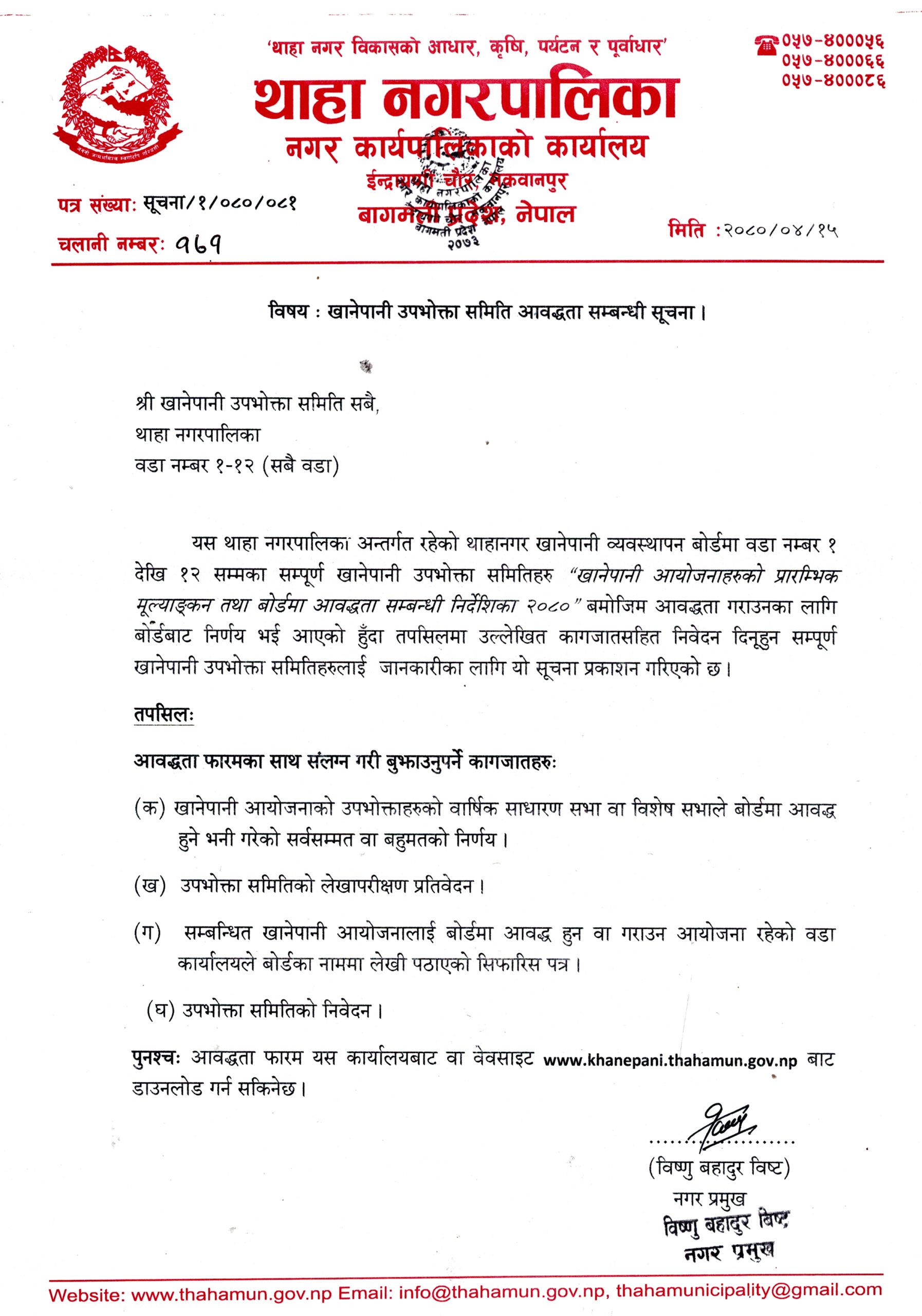 सूचना अनुसार थाहा नगरपालिकाको १ देखि १२ नम्बर वडासम्मका खानेपानी उपभोक्ताहरुले बोर्डमा आवद्ध हुनका लागि निवेदन पेश गर्न सक्नेछन् । आवद्धताको लागि “खानेपानी आयोजनाहरुको प्रारम्भिक मूल्याङ्कन तथा बोर्डमा आवद्धता सम्बन्धी निर्देशिका २०८०” बमोजिम उपभोक्ता समितिहरुले आवश्यक कागजातसहित आवद्धता हुनका लागि निवेदन दिनूपर्ने हुन्छ । निर्देशिका अनुसार बोर्डमा आवद्धताको लागि उपभोक्ता समितिहरुले वार्षिक साधारण सभा वा विशेष सभाले बोर्डमा आवद्ध हुने भनी गरेको सर्वसम्मत वा बहुमतको निर्णय, उपभोक्ता समितिको लेखापरीक्षण प्रतिवेदन, सम्बन्धित खानेपानी आयोजनालाई बोर्डमा आवद्ध हुन वा गराउन आयोजना रहेको वडा कार्यालयले बोर्डका नाममा लेखी पठाएको सिफारिस पत्र र उपभोक्ता समितिको निवेदन संलग्न गरी आवद्धताको लागि पेश गर्नुपर्नेछ ।