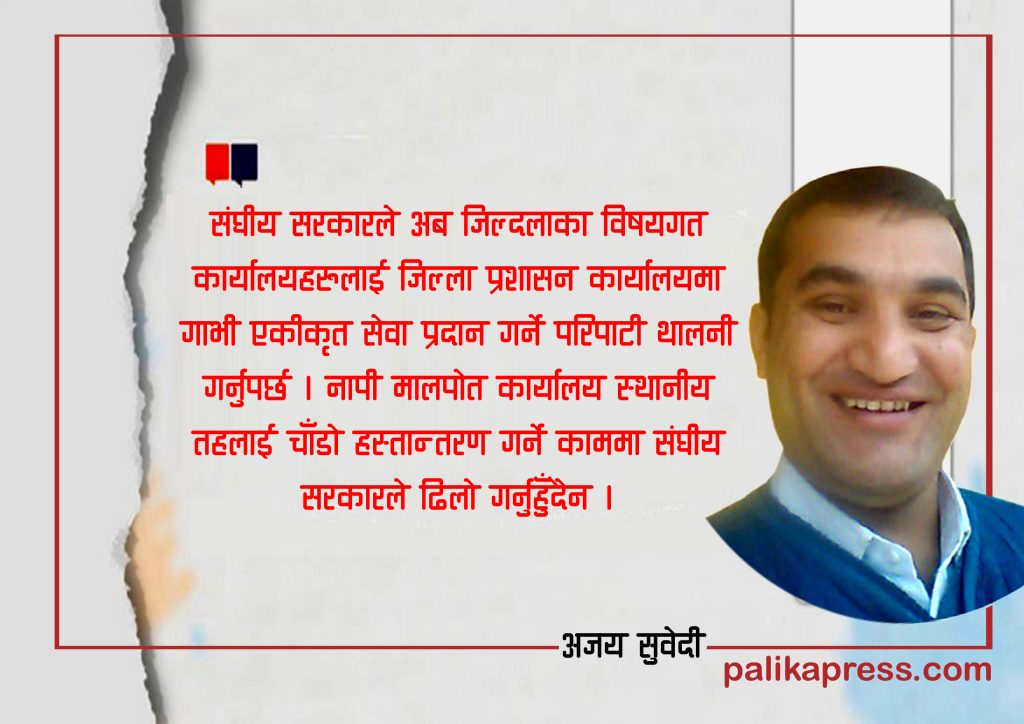 यस विषयमा राजनितिक दलहरुले पहलकदमी लिन ढिलो गर्नु हुदैन तर यस्तो अवस्थामा यसको परम्परागत कार्यशैलीमा परिवर्तन चाहि जरुरी देखिन्छ । संघीय सरकारले अव जिल्लाका विषयगत कार्यालयहरुलाई जिल्ला प्रशासन कार्यालयमा गाभी एकिकृत सेवा प्रदान गर्ने परिपाटीको थालनी गर्नुपर्छ । नापी र मालपोत कार्यालय स्थानीय तहलाई चाडो हस्तान्तरण गर्ने काममा संघीय सरकारले ढिलो गर्नु हुदैन । २३ वर्ष पहिले स्यानीय स्वायत्त शासन ऐन, २०५५ ले नगरपालिका र जिल्ला विकाश समितिलाई कृषि, पशु, वन, महिला वालवालिका , शिक्षा र स्वास्थ्य लगायताका विषयगत अधिकारको निक्षेपण गर्दा जिल्लामा नेपाल सरकारले बिषयगत कार्यालय स्थापना नगर्ने भनिएको थियो तर प्रतिवद्धता विपरित नेपाल सरकारले विषयगत कार्यालय खोल्ने कार्यलाई निरन्तरता दिएको थियो तापनि अव संघीय सरकारले हिजो गरेको ऐतिहासिक गल्तिलाई दोर्याउनु भने हुदैन ।