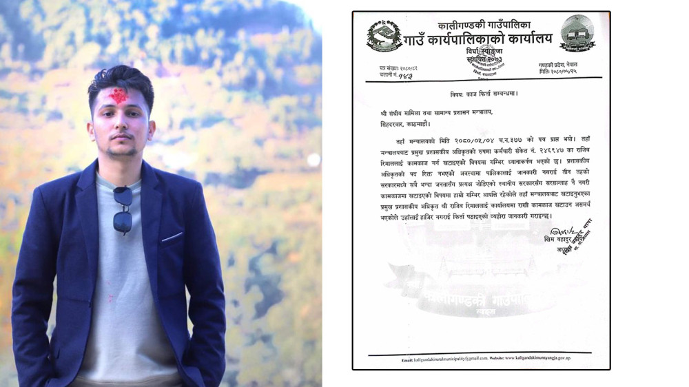 कालीगण्डकी गाउँपालिकाका अध्यक्ष खिमबहादुर थापाले संघीय मामिला तथा प्रशासन मन्त्रालयमा नै काज फिर्ता गरिएको पत्रमार्फत जनाएका छन् । पत्रमा भनिएको छ, ‘तीन तहको सरकारमध्ये सबैभन्दा बढी प्रत्यक्ष रूपमा जनतासँग जोडिएको सरकारसँग सल्लाह नै नगरी कामकाजमा खटाइएको विषयमा हाम्रो गम्भीर आपत्ति रहेकोले मन्त्रालयबाट खटाइनुभएका प्रमुख प्रशासकीय अधिकृत राजीव रिमाललाई कार्यालयमा राखी कामकाजमा खटाउन असमर्थ भएकाले उहाँलाई हाजिर नगराई फिर्ता पठाइएको व्यवहोरा जानकारी गराइन्छ ।’