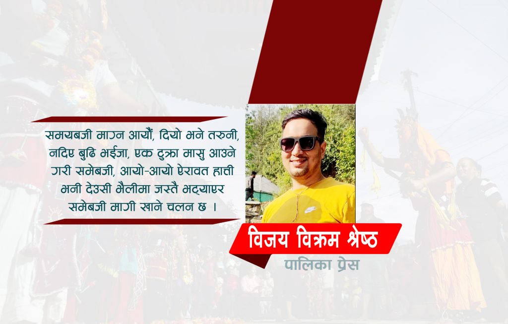 समेबजी फोनेः, विउसा ल्यासे, मविउसा बुढिचाः, ला छकु वेक समेवजी, वल वल वुलु किसीकिसी अर्थात समयबजी माग्न आयौें, दियो भने तरुनी, नदिए बुढि भईजा, एक टुक्रा मासु आउने गरी समेवजी, आयो आयो ऐरावत हाती भनी देउसी भैलीमा जस्तै भट्याएर समेबजी मागी खाने चलन छ ।
