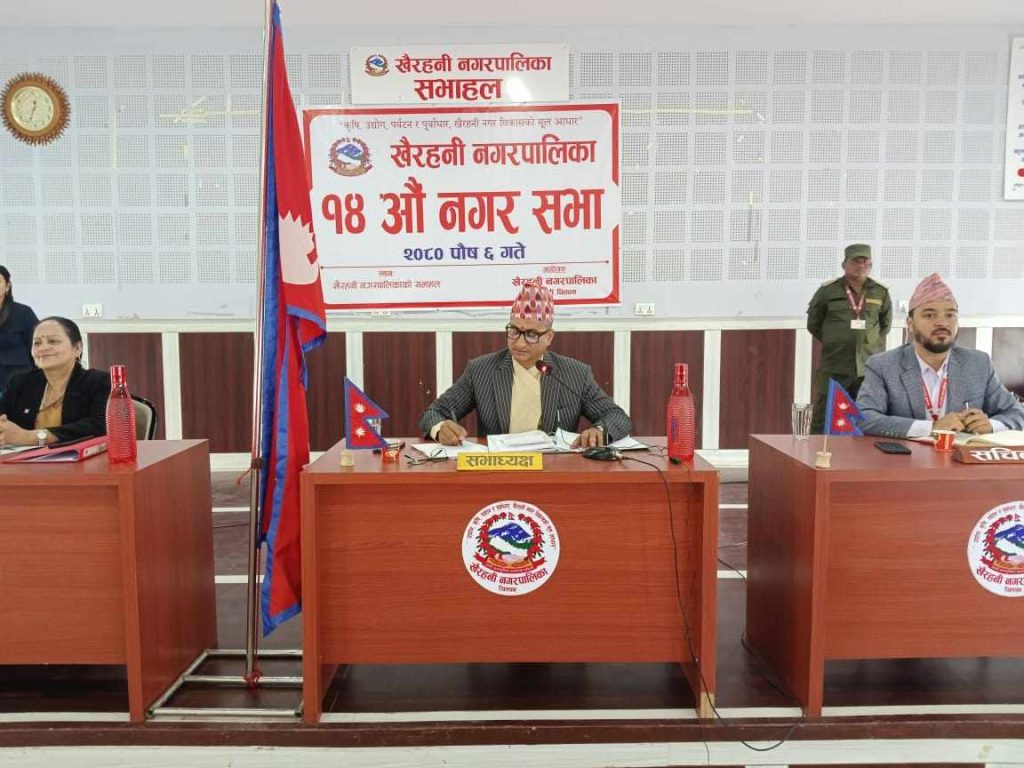 खैरहनी नगरपालिकाको चौधौं नगरसभामा कार्यपालिकाले चालु आव श्रावणदेखि हालसम्म गरेका निर्णयहरु अनुमोदन गर्ने सम्बन्धी प्रस्ताव, खैरहनी नगर अस्पतालको संगठन तथा व्यवस्थापन सर्वेक्षण प्रतिवेदन समेत सर्वसम्मतिले पारित गर्दै चौधौं नगरसभा सम्पन्न भएको नगरपालिकाका प्रमुख प्रशासकीय अधिकृत विष्णु सापकोटाले जनाएका छन् ।