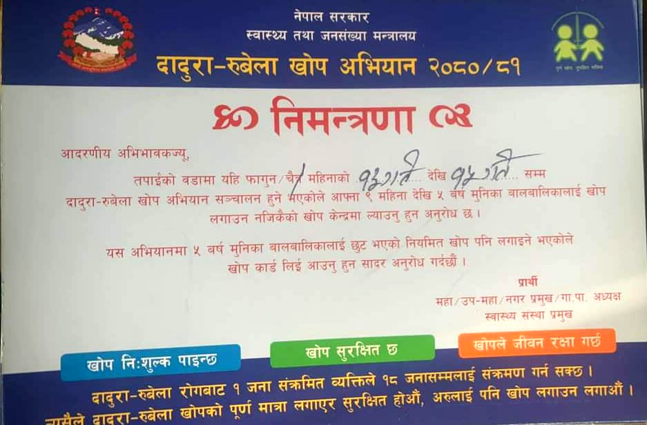 नौ महिनादेखि ५ वर्ष मुनिका बालबालिकालाई खोप लगाउन नसिजकैको खोप केन्द्रमा लैजानको लागि निमन्त्रणा कार्डमा अनुरोध गरिएको छ । अभियानमा ५ वर्ष मुनिका बालबालिकालाई छुट भएको नियमित खोप लगाइने गाउँपालिकाले जनाएको छ । ‘यसका लागि खोपकार्ड लिई आउनुहुन सादर अनुरोध गर्दछौं’–निमन्त्रणा कार्यमा लेखिएको छ ।